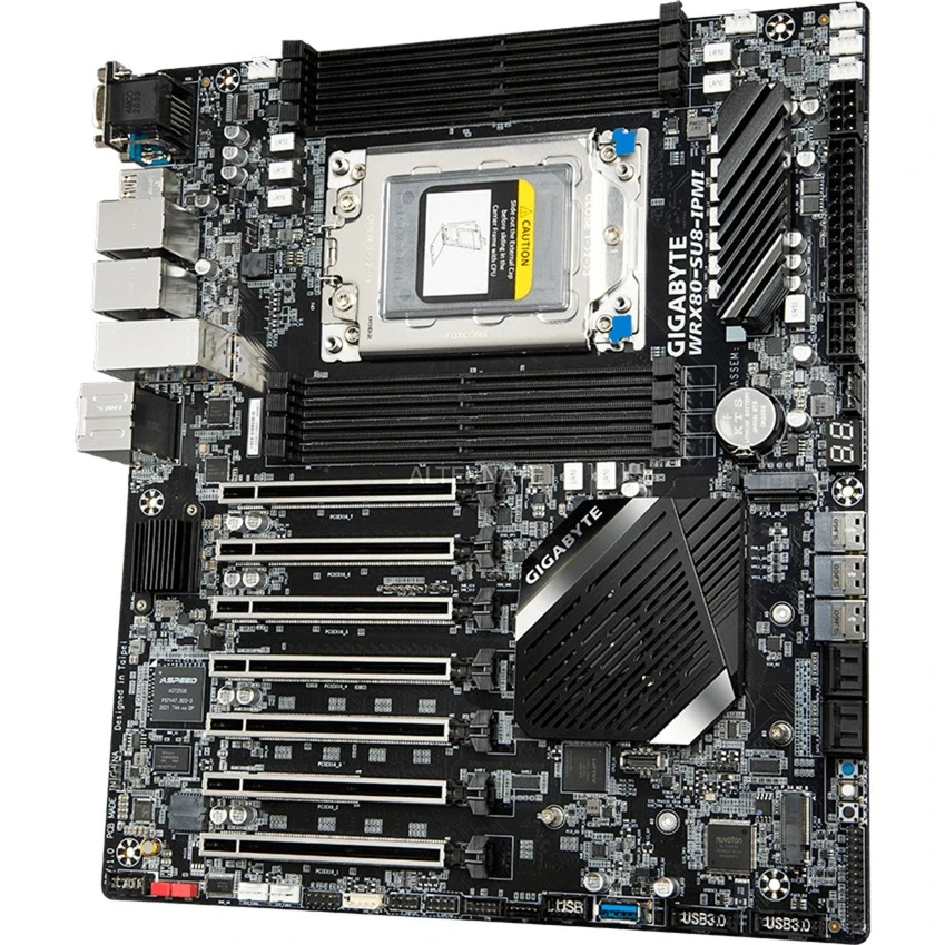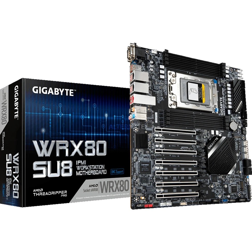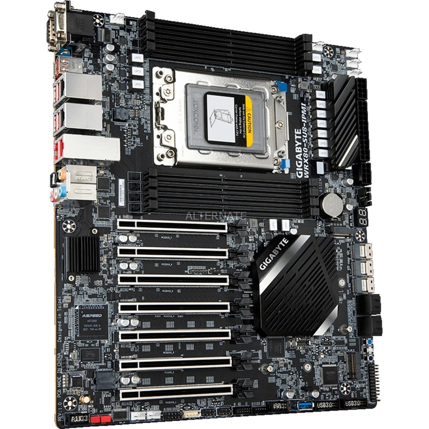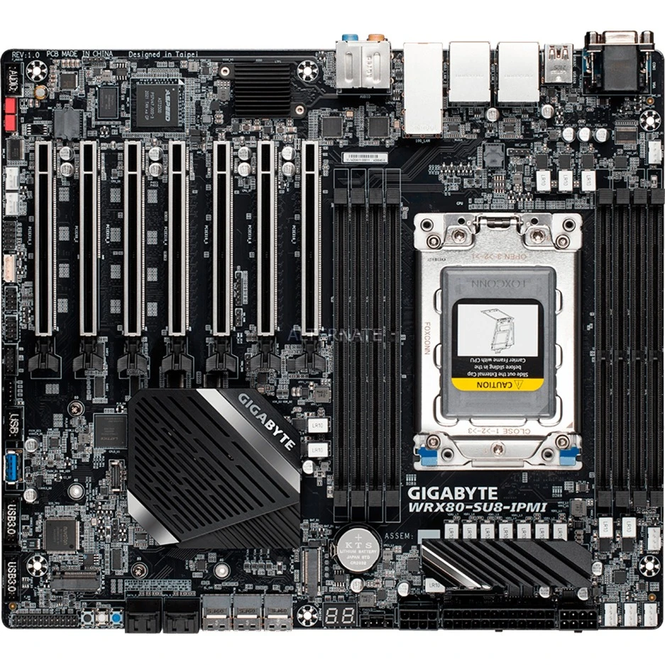 Das GIGABYTE WRX80-SU8-IPMI basiert auf dem AMD-TRX40-Chipsatz und unterstützt AMD-Prozessoren für den Sockel sTRX4. Es verfügt über acht DDR4-Slots für bis zu 2 TB Arbeitsspeicher im Quad-Channel Betrieb. Zur weiteren Ausstattung des GIGABYTE WRX80-SU8-IPMI gehören sieben PCIe-4.0-x16-Slots. Außerdem verfügt das GIGABYTE WRX80-SU8-IPMI über 8-Kanal-Sound, vier 10 Gigabit-LAN-Schnittstellen sowie vier SATA3-, drei M.2-Anschlüsse und eine Reihe an USB Schnittstellen.