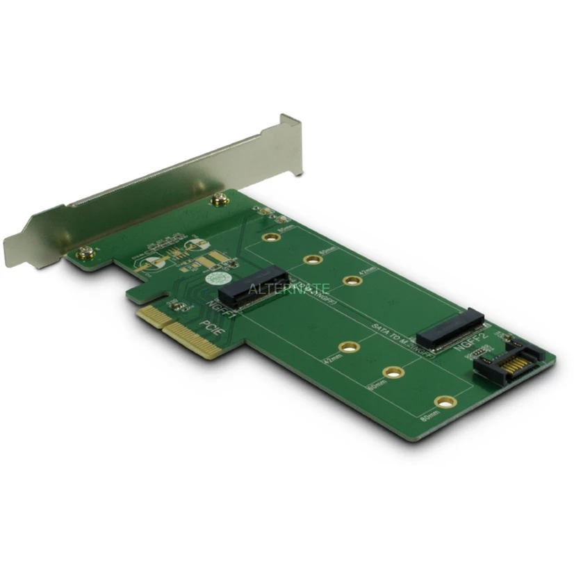 Die Inter-Tech KT015 Karte bietet die Möglichkeit je eine M.2 PCIe SSD sowie M.2 S-ATA SSD (je Breite 22 mm / Länge 42, 60 oder 80 mm) in ein normales PC-Gehäuse einzubauen. Die Karte wird über eine PCIe x4 Schnittstelle betrieben und bietet für die PCIe SSD eine besonders schnelle Datenübertragung von bis zu 3938 MB/s. Die M.2 S-ATA SSD wird über ein S-ATA-Datenkabel angesteuert und kann bis zu 600 MB/s Übertragungsgeschwindigkeit realisieren. Man montiert einfach die SSDs auf dem jeweils dafür vorgesehenen Steckplatz auf der Platine und steckt dann die Karte in einen freien PCIe Slot. Montageschrauben sowie ein kleiner Schraubenzieher liegen der Karte bei.