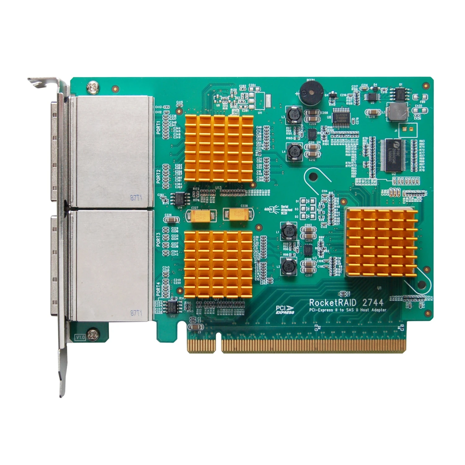 Der HighPoint RocketRAID 2744 ist ein RAID-Controller mit 16 externen SAS/SATA-Anschlüssen (6 GBit/s, über vier SFF-8088-Ports) und Unterstützung für die RAID-Level 0, 1, 5, 10, 50 sowie JBOD. Der RocketRAID 2744 mit PCIe-2.0-x16-Interface verfügt über HighPoints fortschrittliche RAID-Technologien wie Online Capacity Expansion und RAID Level Migration, Hot-Swap (Austausch von Laufwerken im laufenden Betrieb) uvm.