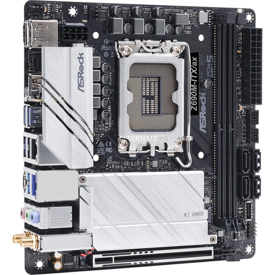 Das ASRock Z690M-ITX/ax Mainboard basiert auf dem Intel®-Z690-Chipsatz und unterstützt Intel®-Prozessoren für den Sockel 1700 der 12ten Generation. Es verfügt über zwei DDR4-DIMM-Slots im Dual-Channel-Betrieb für bis zu 64 GB Arbeitsspeicher. Zur weiteren Ausstattung des ASRock Z690M-ITX/ax gehört ein PCIe-5.0-x16-Slot. Außerdem verfügt das ASRock Z690M-ITX/ax über 8-Kanal-Sound, eine 2.5 Gigabit-LAN-Schnittstelle, eine Gigabit-LAN-Schnittstelle, drei SATA3-Anschlüsse, zwei M.2-Anschlüsse, WiFi 6E, Bluetooth 5.2 und eine Reihe an USB Schnittstellen.