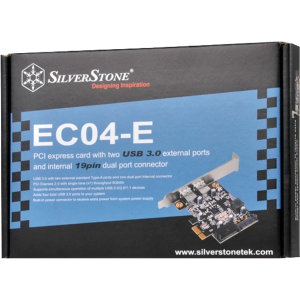 SilverStone kreierte mit der EC04-E eine exzellente Erweiterungskarte, welche mit dem Mainboard via Single-Lane PCI-Express 2.0 verbunden ist und zwei externe sowie einen Dual-Port USB-3.0-Anschluss für ein Maximum an Kompatibilität und Flexibilität unterstützt. Diese Erweiterungskarte ist ein tolles Add-on für Systeme, die Verbindungen zu mehreren USB-3.0-Geräten wie SilverStones eigenen Festplattengehäusen RVS02 und TS07 erfordern.
