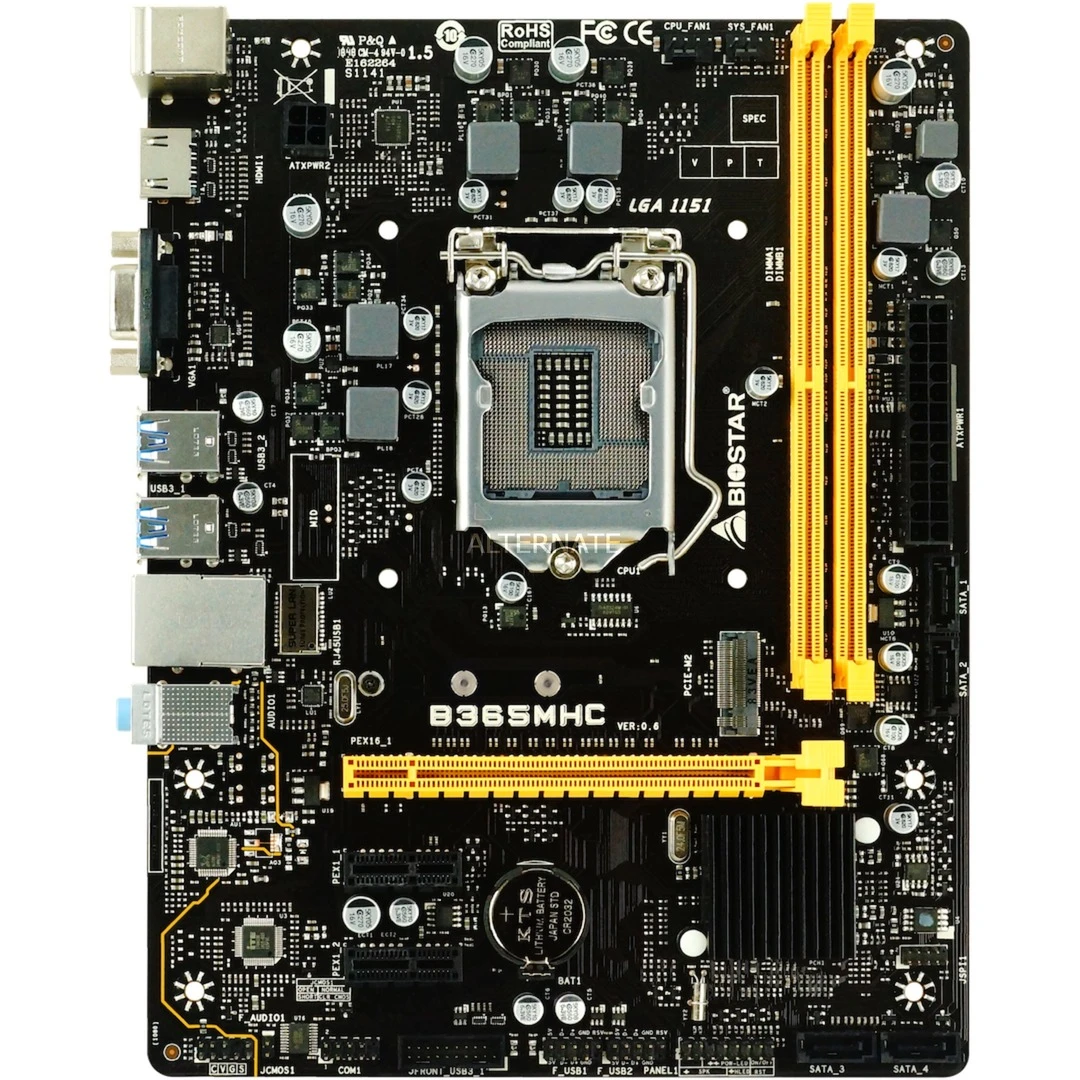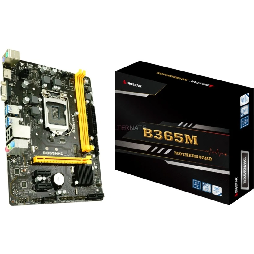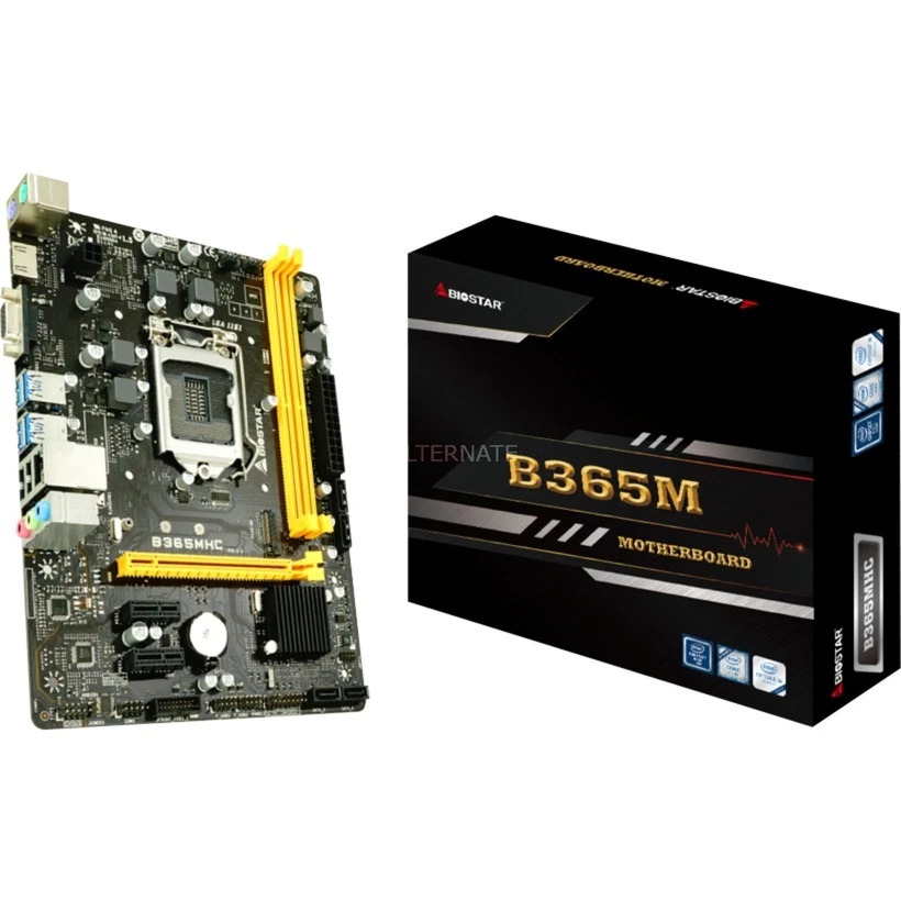 Das Biostar B365MHC basiert auf dem Intel®-B365-Chipsatz und unterstützt Intel®-Prozessoren für den Sockel 1151. Es verfügt über vier DIMM-Slots im Dual-Channel-Betrieb für bis zu 64 GB Arbeitsspeicher. Zur weiteren Ausstattung des Biostar B365MHC gehören ein PCIe-3.0-x16-Slot und zwei PCIe-3.0-x1-Slots. Außerdem verfügt das Biostar B365MHC über 8-Kanal-Sound, eine Gigabit-LAN-Schnittstelle sowie sechs SATA3-Anschlüsse und eine M.2-Schnittstelle für PCIe- oder SATA-SSD-Module.