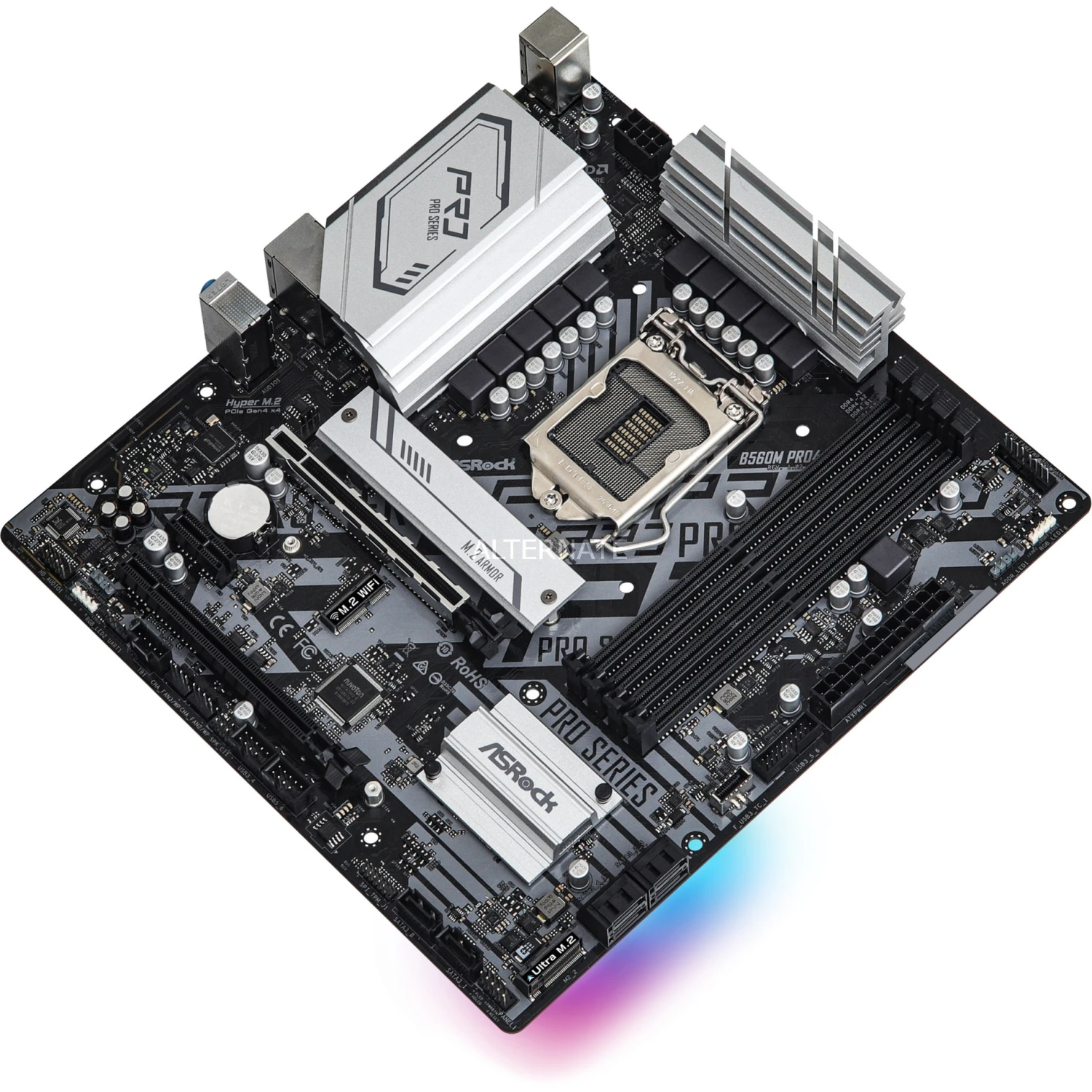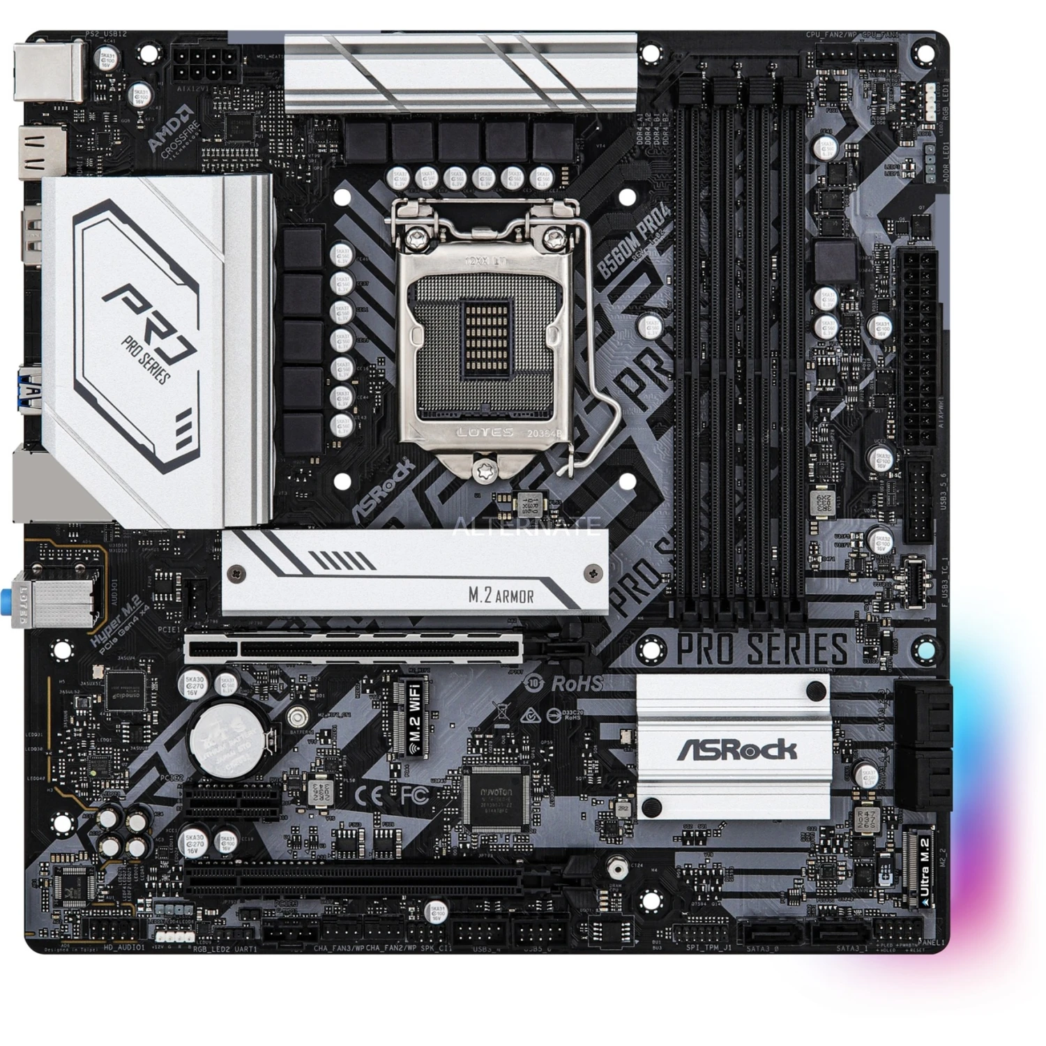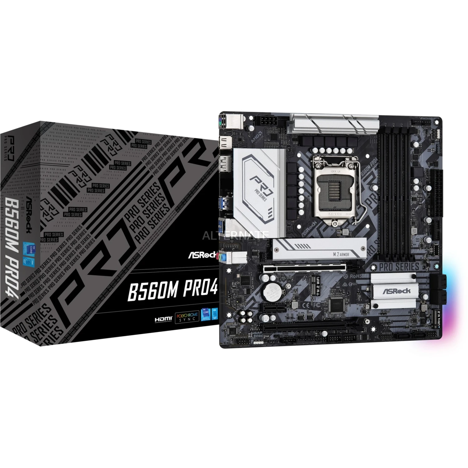 Das ASRock B560M Pro4 Mainboard basiert auf dem Intel®-B560-Chipsatz und unterstützt Intel®-Prozessoren für den Sockel 1200 der 10ten und 11ten Generation. Es verfügt über vier DDR4-DIMM-Slots im Dual-Channel-Betrieb für bis zu 128 GB Arbeitsspeicher. Zur weiteren Ausstattung des ASRock B560M Pro4 gehören ein PCIe-4.0-x16-Slot, ein PCIe-3.0-x16-Slot und ein PCIe-3.0-x1-Slot. Außerdem unterstützt das ASRock B560M Pro4 die Intel® Optane™ Memory Technologie und verfügt über 8-Kanal-Sound, eine Gigabit-LAN-Schnittstelle, sechs SATA3-Anschlüsse, zwei M.2-Anschlüsse und eine Reihe an USB Schnittstellen.