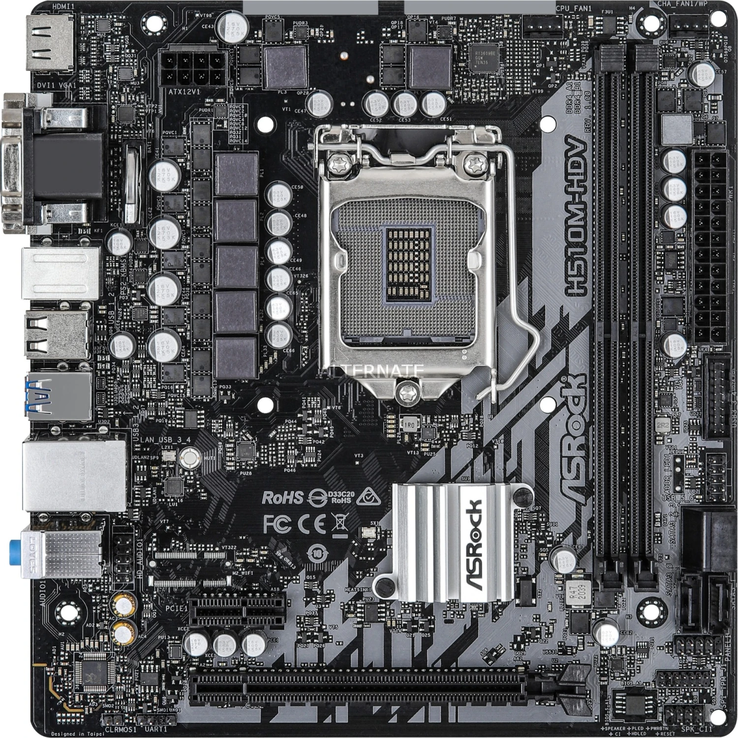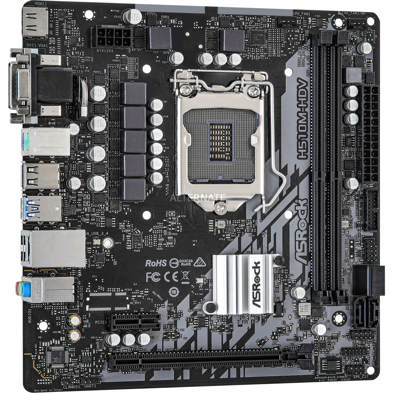 Das ASRock H510M-HDV Mainboard basiert auf dem Intel®-H510-Chipsatz und unterstützt Intel®-Prozessoren für den Sockel 1200 der 10ten und 11ten Generation. Es verfügt über zwei DDR4-DIMM-Slots im Dual-Channel-Betrieb für bis zu 64 GB Arbeitsspeicher. Zur weiteren Ausstattung des ASRock H510M-HDV gehören ein PCIe-4.0-x16-Slot ein PCIe-3.0-x1-Slot. Außerdem unterstützt das ASRock H510M-HDV die Intel® Optane™ Memory Technologie und verfügt über 8-Kanal-Sound, eine Gigabit-LAN-Schnittstelle, vier SATA3-Anschlüsse und eine Reihe an USB Schnittstellen.