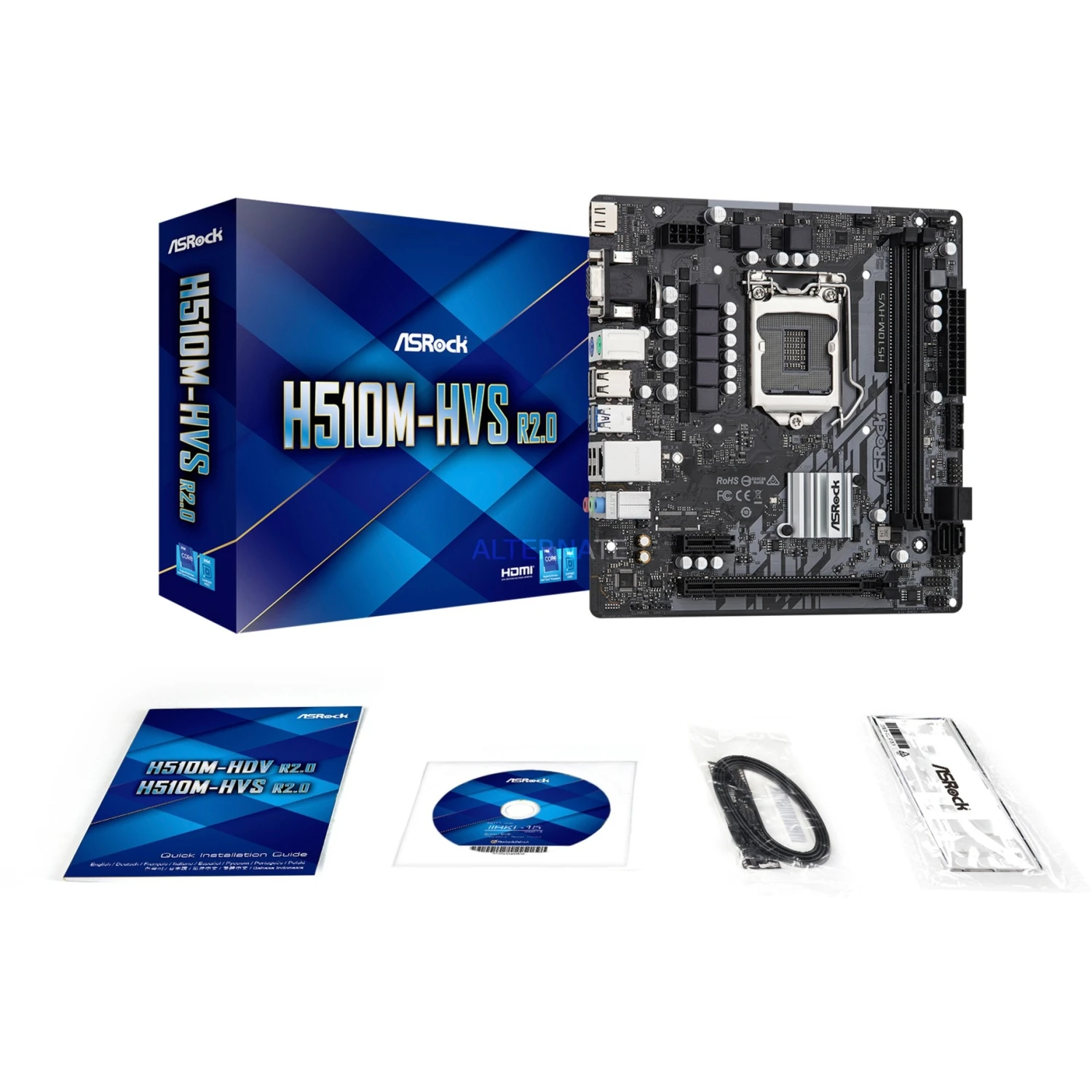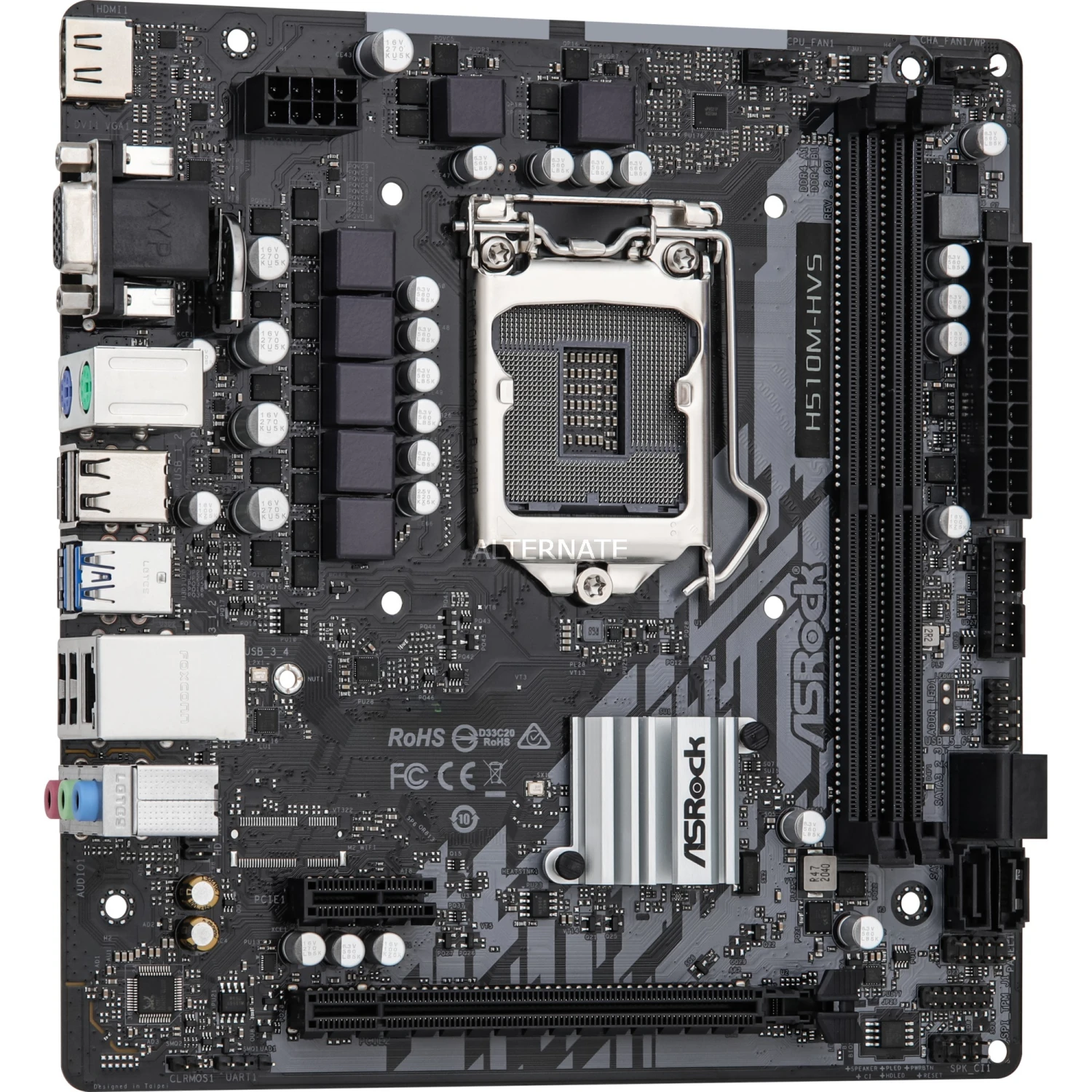 Das ASRock H510M-HVS R2.0 Mainboard basiert auf dem Intel®-H510-Chipsatz und unterstützt Intel®-Prozessoren für den Sockel 1200 der 10ten und 11ten Generation. Es verfügt über zwei DDR4-DIMM-Slots im Dual-Channel-Betrieb für bis zu 64 GB Arbeitsspeicher. Zur weiteren Ausstattung des ASRock H510M-HVS R2.0 gehören ein PCIe-4.0-x16-Slot ein PCIe-3.0-x1-Slot. Außerdem unterstützt das ASRock H510M-HVS R2.0 die Intel® Optane™ Memory Technologie und verfügt über 8-Kanal-Sound, eine Gigabit-LAN-Schnittstelle, vier SATA3-Anschlüsse und eine Reihe an USB Schnittstellen.