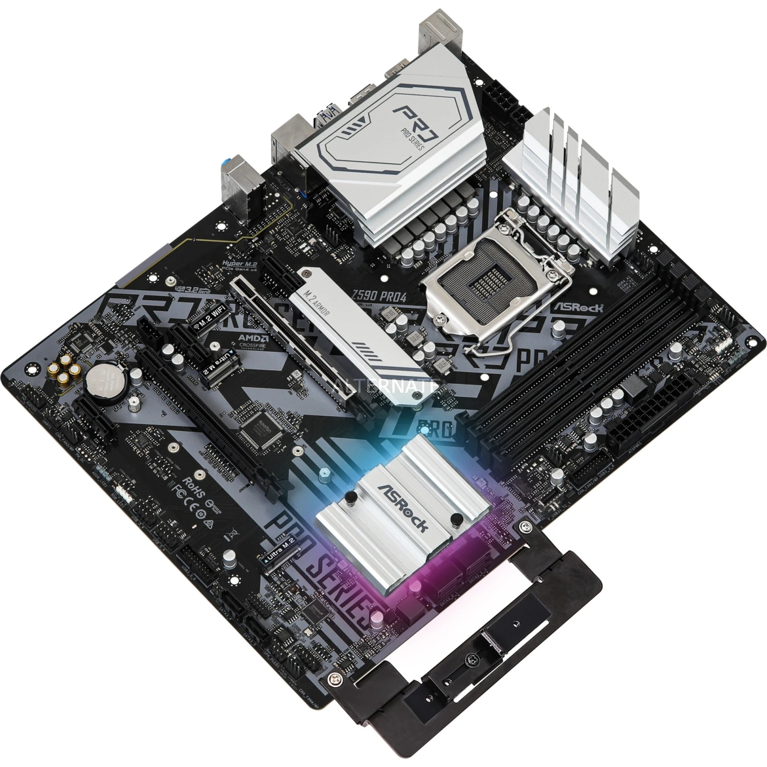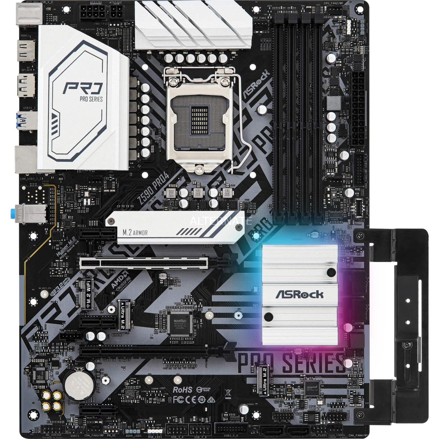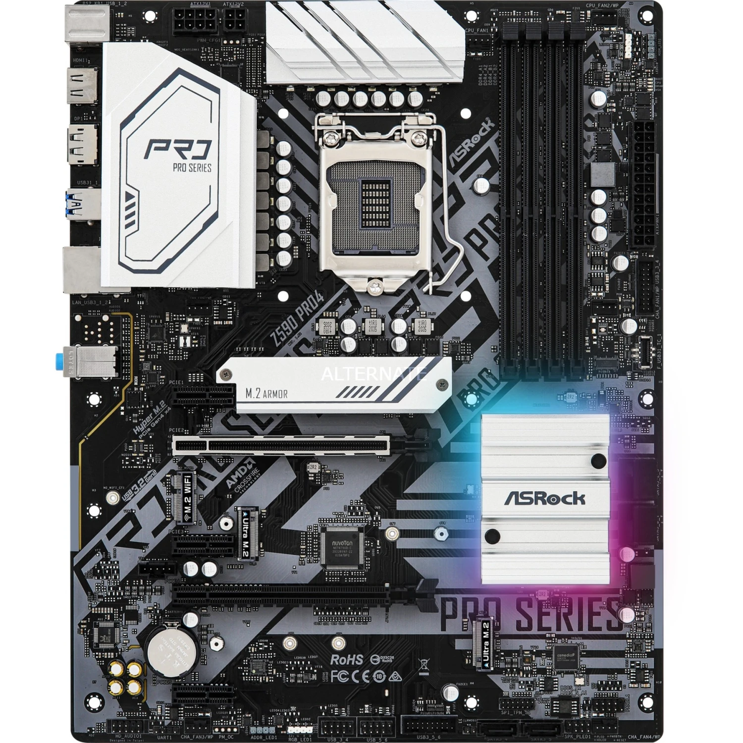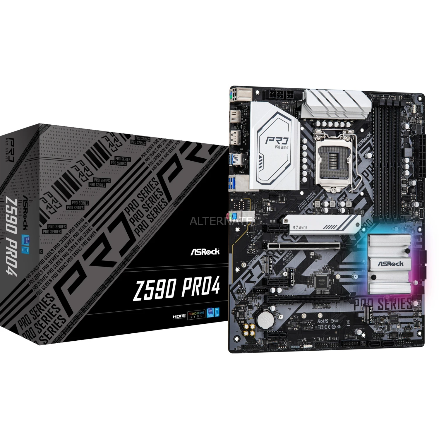 Das ASRock Z590 Pro4 Mainboard basiert auf dem Intel®-Z590-Chipsatz und unterstützt Intel®-Prozessoren für den Sockel 1200 der 10ten und 11ten Generation. Es verfügt über vier DDR4-DIMM-Slots im Dual-Channel-Betrieb für bis zu 128 GB Arbeitsspeicher. Zur weiteren Ausstattung des ASRock Z590 Pro4 gehören zwei PCIe-4.0-x16-Slots und drei PCIe-3.0-x1-Slots. Außerdem unterstützt das ASRock Z590 Pro4 die Intel® Optane™ Memory Technologie und verfügt über 8-Kanal-Sound, eine 2.5 Gigabit-LAN-Schnittstelle, sechs SATA3-Anschlüsse, drei M.2-Anschlüsse und eine Reihe an USB Schnittstellen.