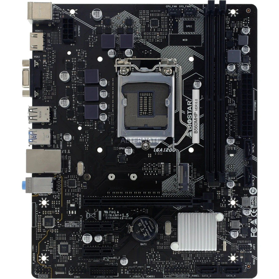 Das Biostar B560MHP 6.0 Mainboard basiert auf dem Intel®-B560-Chipsatz und unterstützt Intel®-Prozessoren für den Sockel 1200 der 10ten und 11ten Generation. Es verfügt über zwei DDR4-DIMM-Slots im Dual-Channel-Betrieb für bis zu 64 GB Arbeitsspeicher. Zur weiteren Ausstattung des Biostar B560MHP 6.0 gehören ein PCIe-4.0-x16-Slot und zwei PCIe-3.0-x1-Slots. Außerdem unterstützt das Biostar B560MHP 6.0 die Intel® Optane™ Memory Technologie und verfügt über 8-Kanal-Sound, eine Gigabit-LAN-Schnittstelle, vier SATA3-Anschlüsse, ein M.2-Anschluss und eine Reihe an USB Schnittstellen.