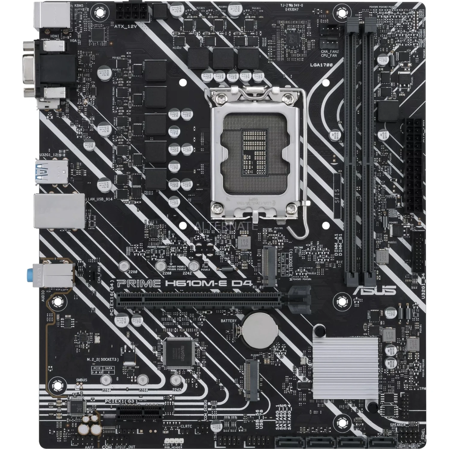 Das ASUS PRIME H610M-E D4-CSM Mainboard basiert auf dem Intel®-H610-Chipsatz und unterstützt Intel®-Prozessoren für den Sockel 1700 der 12ten Generation. Es verfügt über zwei DDR4-DIMM-Slots im Dual-Channel-Betrieb für bis zu 64 GB Arbeitsspeicher. Zur weiteren Ausstattung des ASUS PRIME H610M-E D4-CSM gehören ein PCIe-4.0-x16-SlotNe und ein PCIe-3.0-x1-Slot. Außerdem verfügt das ASUS PRIME H610M-E D4-CSM über 8-Kanal-Sound, eine Gigabit-LAN-Schnittstelle, vier SATA3-Anschlüsse, zwei M.2-Anschlüsse und eine Reihe an USB Schnittstellen.