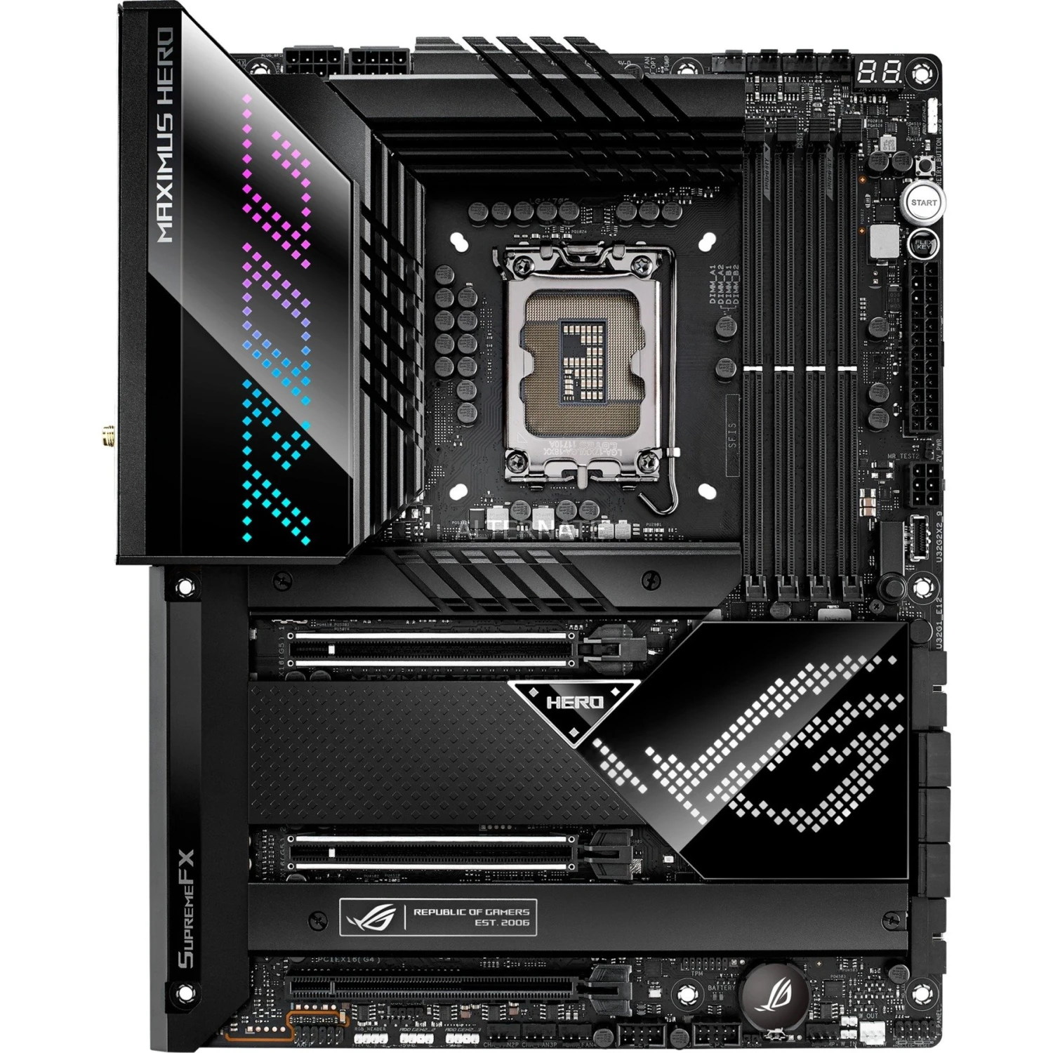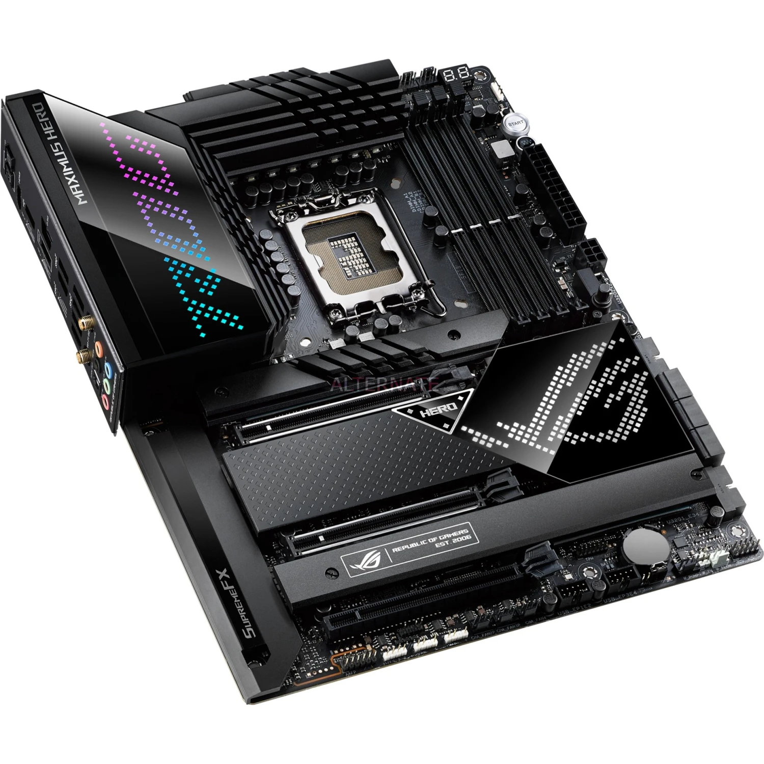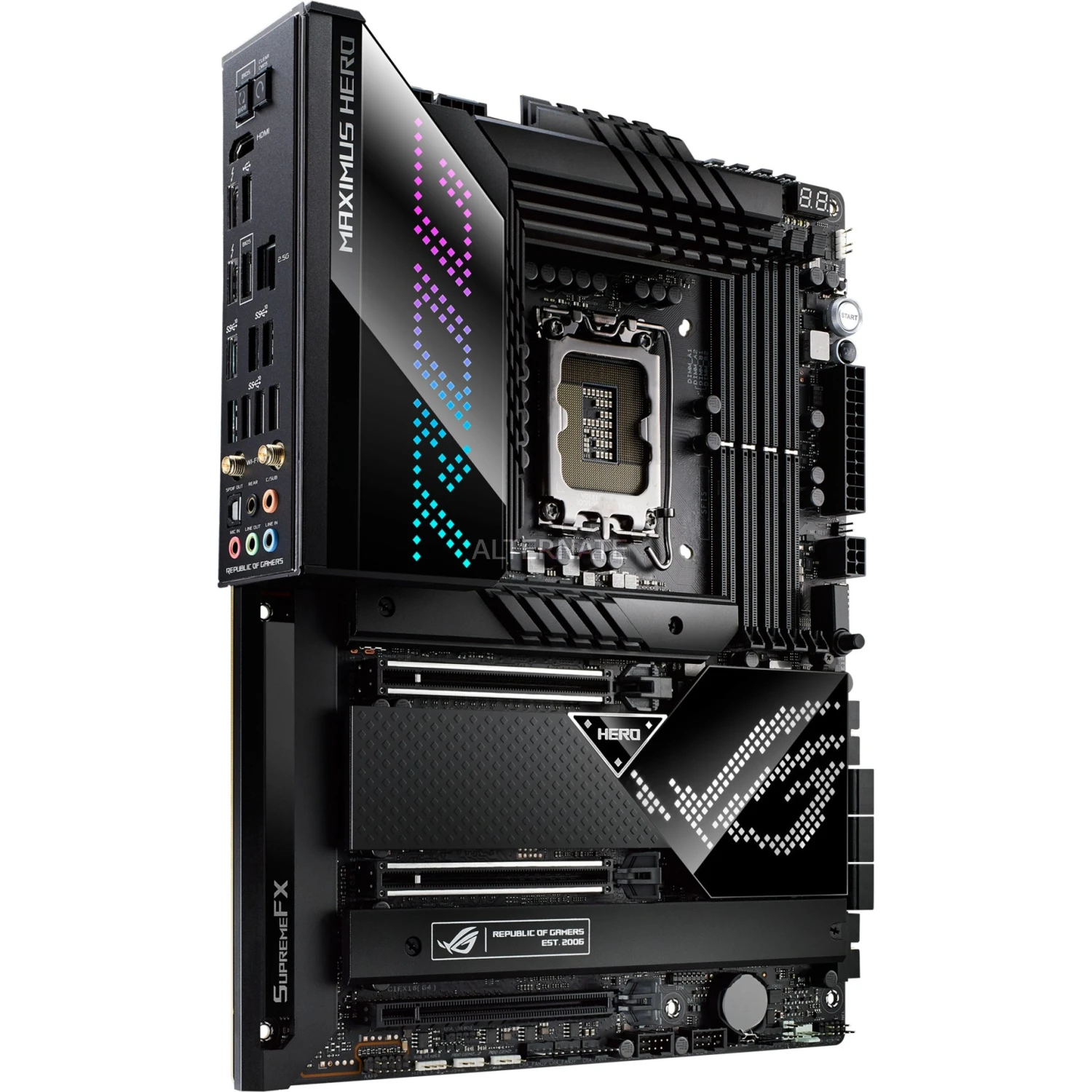 Das ASUS ROG MAXIMUS Z690 HERO Mainboard basiert auf dem Intel®-Z690-Chipsatz und unterstützt Intel®-Prozessoren für den Sockel 1700 der 12ten Generation. Es verfügt über vier DDR5-DIMM-Slots im Dual-Channel-Betrieb für bis zu 128 GB Arbeitsspeicher. Zur weiteren Ausstattung des ASUS ROG MAXIMUS Z690 HERO gehören zwei PCIe-5.0-x16-Slot und ein PCIe-4.0-x16-Slot. Außerdem verfügt das ASUS ROG MAXIMUS Z690 HERO über 8-Kanal-Sound, eine 2,5 Gigabit-LAN-Schnittstelle, sechs SATA3-Anschlüsse, Thunderbolt 4 Typ-C Ports, bis zu fünf M.2-Anschlüsse, WiFi 6E, Bluetooth 5.2 und eine Reihe an USB Schnittstellen.