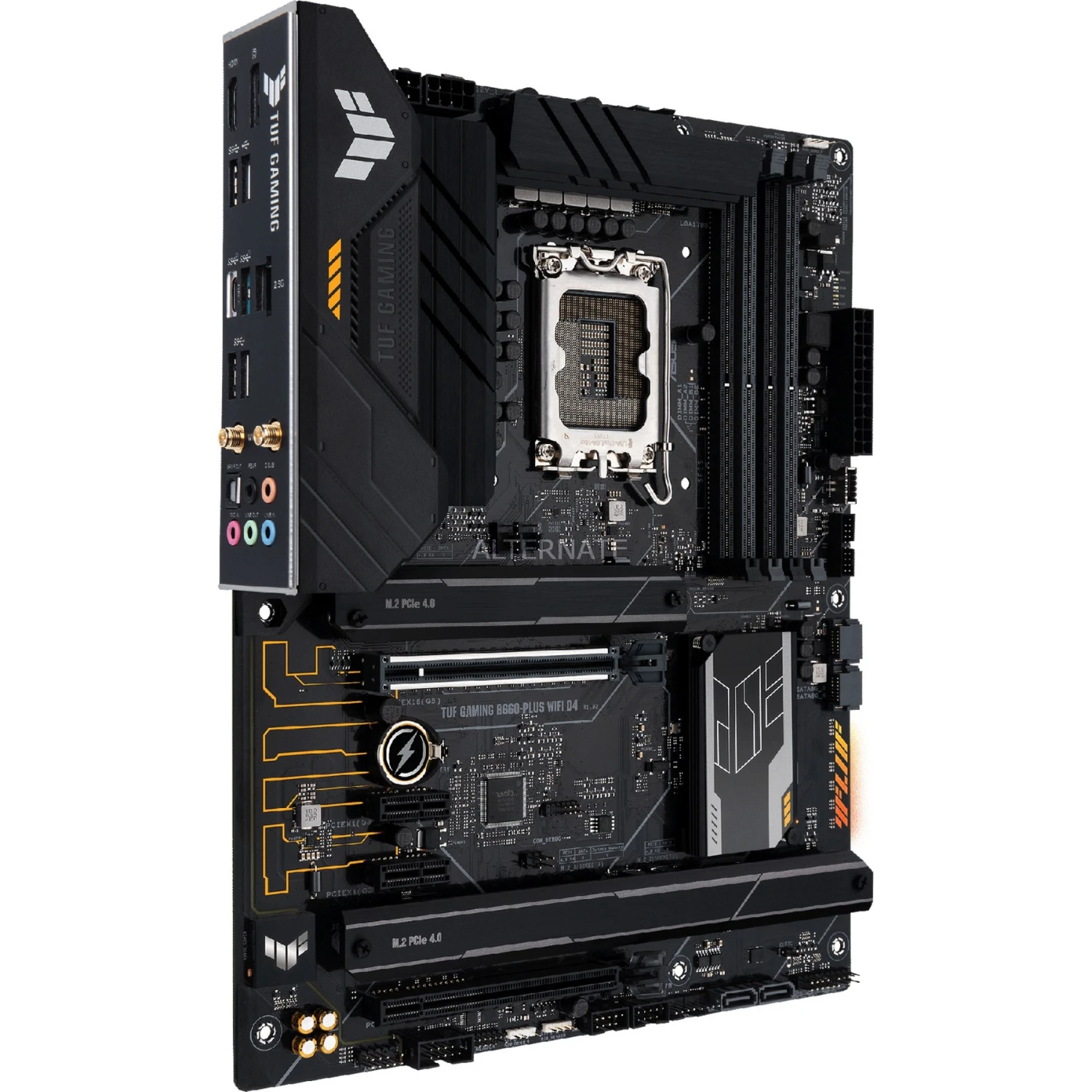 Das ASUS TUF GAMING B660-PLUS WIFI D4 Mainboard basiert auf dem Intel®-B660-Chipsatz und unterstützt Intel®-Prozessoren für den Sockel 1700 der 12ten Generation. Es verfügt über vier DDR4-DIMM-Slots im Dual-Channel-Betrieb für bis zu 128 GB Arbeitsspeicher. Zur weiteren Ausstattung des ASUS TUF GAMING B660-PLUS WIFI D4 gehören ein PCIe-5.0-x16-Slot, ein PCIe-3.0-x16-Slot und zwei PCIe-3.0-x1-Slots. Außerdem verfügt das ASUS TUF GAMING B660-PLUS WIFI D4 über 8-Kanal-Sound, eine 2,5 Gigabit-LAN-Schnittstelle, vier SATA3-Anschlüsse, drei M.2-Anschlüsse, WiFi 6, Bluetooth 5.2 und eine Reihe an USB Schnittstellen.