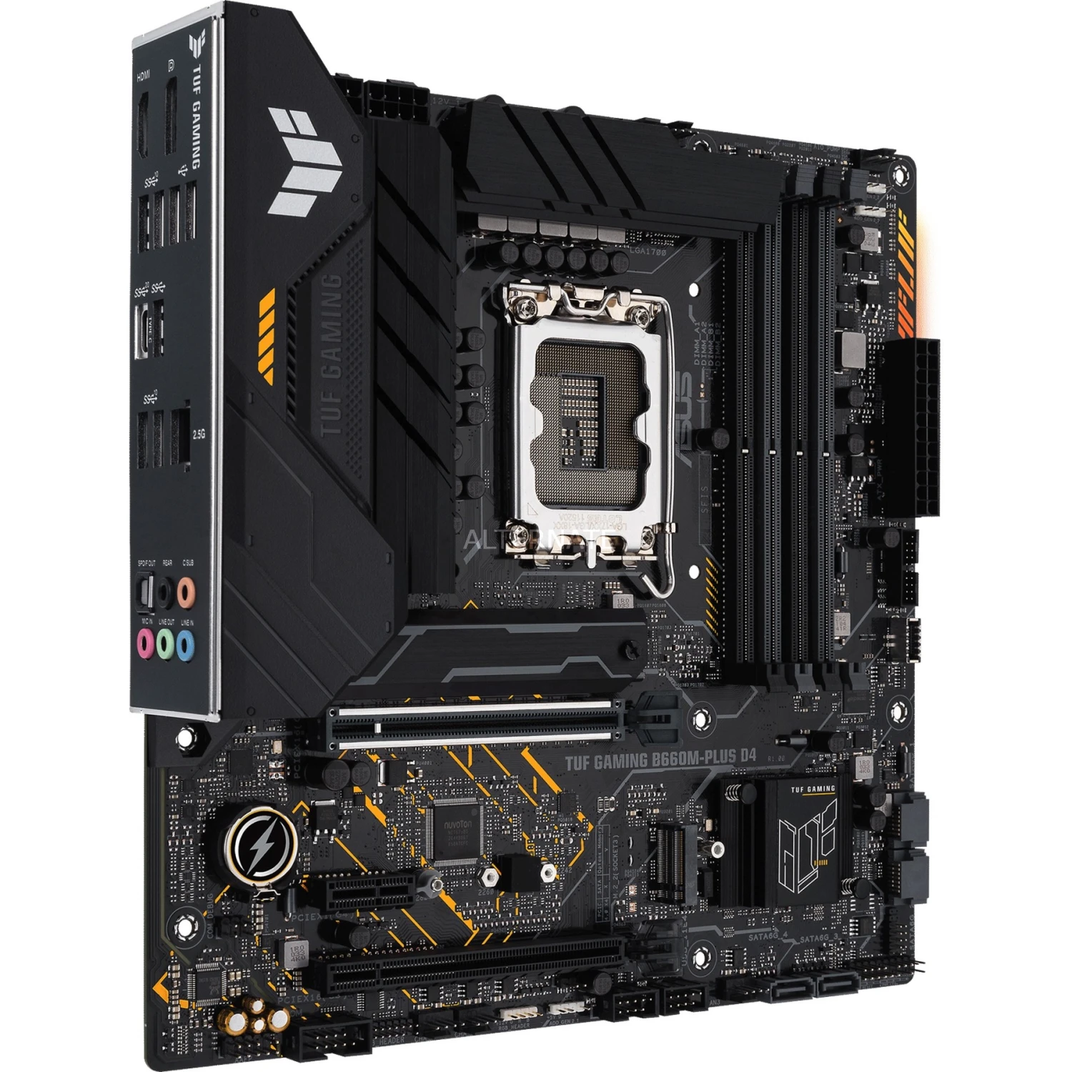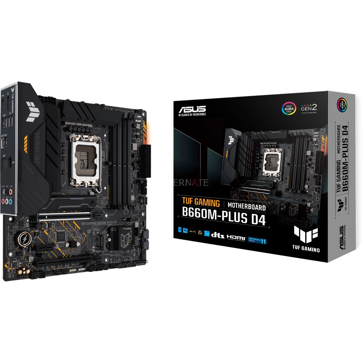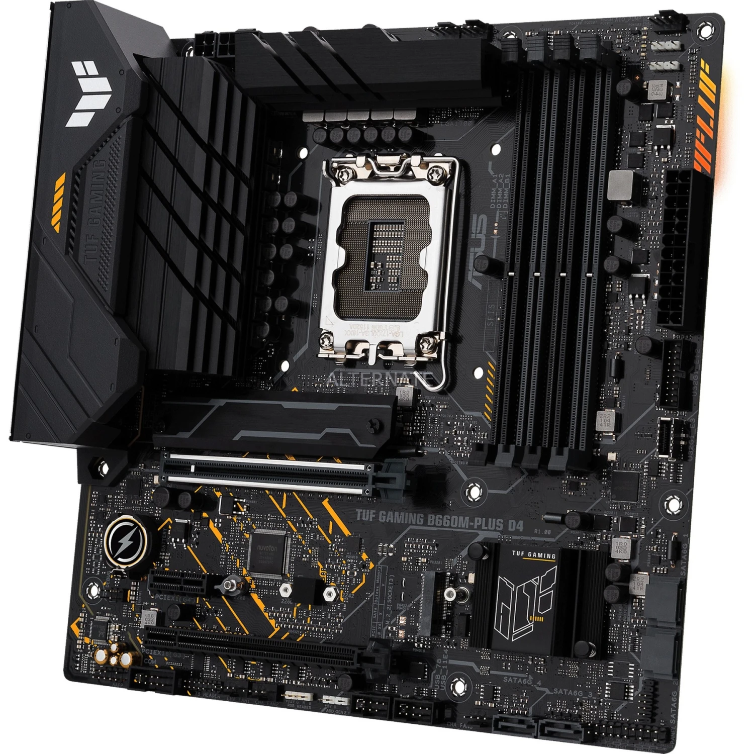 Das ASUS TUF GAMING B660M-PLUS D4 Mainboard basiert auf dem Intel®-B660-Chipsatz und unterstützt Intel®-Prozessoren für den Sockel 1700 der 12ten Generation. Es verfügt über vier DDR4-DIMM-Slots im Dual-Channel-Betrieb für bis zu 128 GB Arbeitsspeicher. Zur weiteren Ausstattung des ASUS TUF GAMING B660M-PLUS D4 gehören ein PCIe-5.0-x16-Slot, ein PCIe-3.0-x16-Slot und ein PCIe-4.0-x1-Slot. Außerdem verfügt das ASUS TUF GAMING B660M-PLUS D4 über 8-Kanal-Sound, eine 2,5 Gigabit-LAN-Schnittstelle, vier SATA3-Anschlüsse, zwei M.2-Anschlüsse und eine Reihe an USB Schnittstellen.