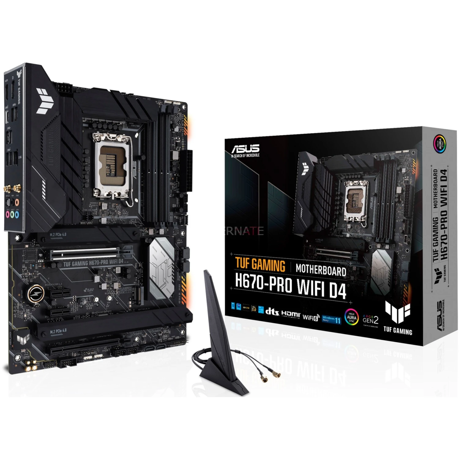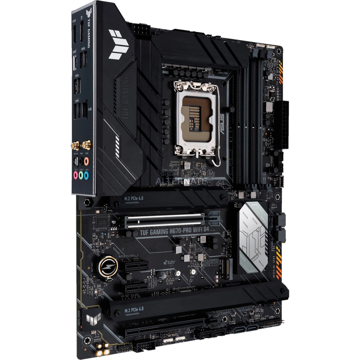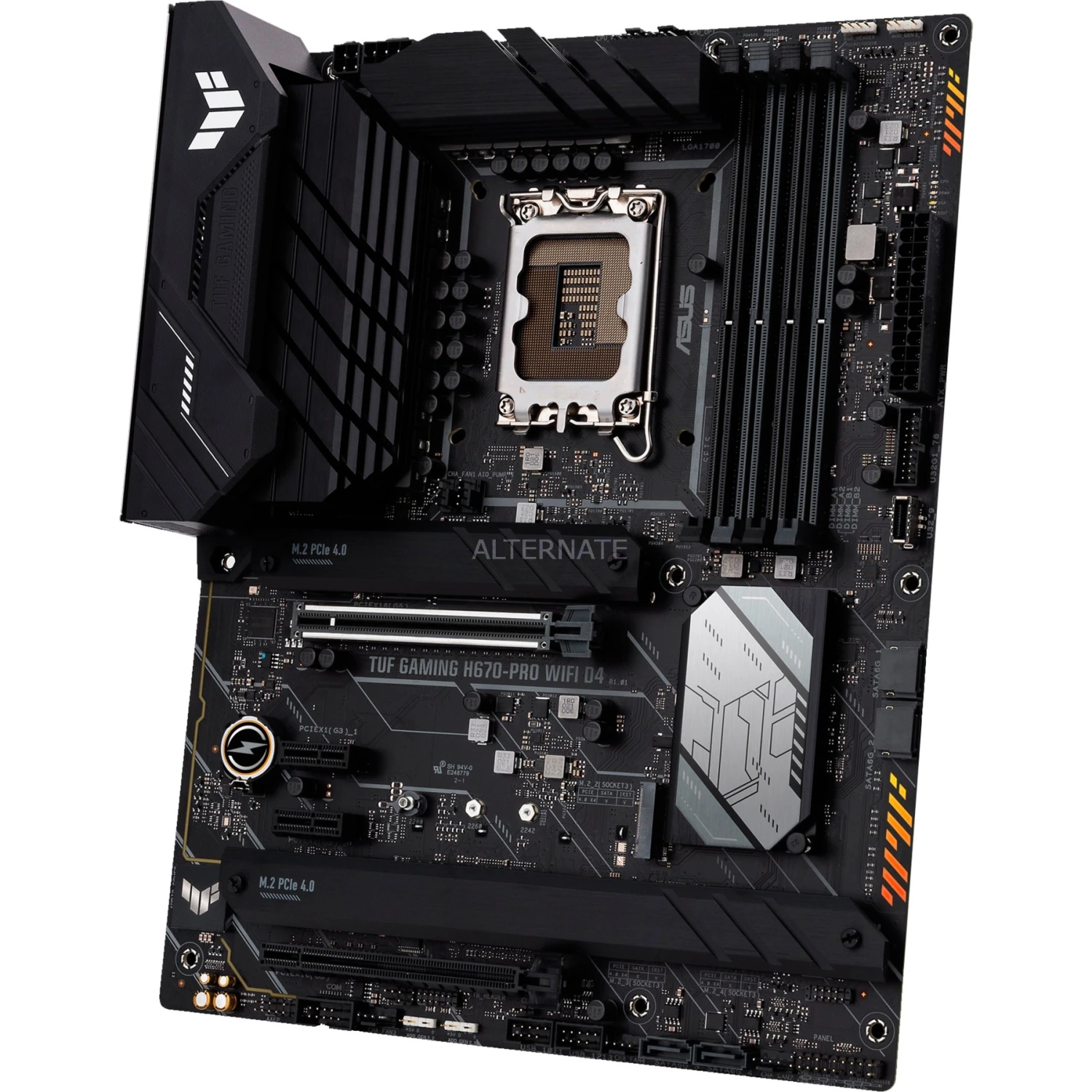 Das ASUS TUF GAMING H670-PRO WIFI D4 Mainboard basiert auf dem Intel®-B670-Chipsatz und unterstützt Intel®-Prozessoren für den Sockel 1700 der 12ten Generation. Es verfügt über vier DDR4-DIMM-Slots im Dual-Channel-Betrieb für bis zu 128 GB Arbeitsspeicher. Zur weiteren Ausstattung des ASUS TUF GAMING H670-PRO WIFI D4 gehören ein PCIe-5.0-x16-Slot, ein PCIe-3.0-x16-Slot und zwei PCIe-3.0-x1-Slots. Außerdem verfügt das ASUS TUF GAMING H670-PRO WIFI D4 über 8-Kanal-Sound, eine 2,5 Gigabit-LAN-Schnittstelle, vier SATA3-Anschlüsse, vier M.2-Anschlüsse, WiFi 6, Bluetooth 5.2 und eine Reihe an USB Schnittstellen.