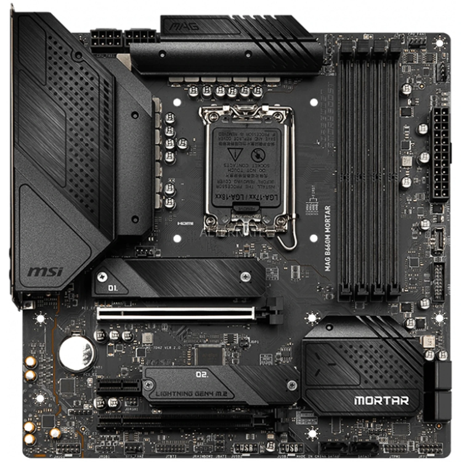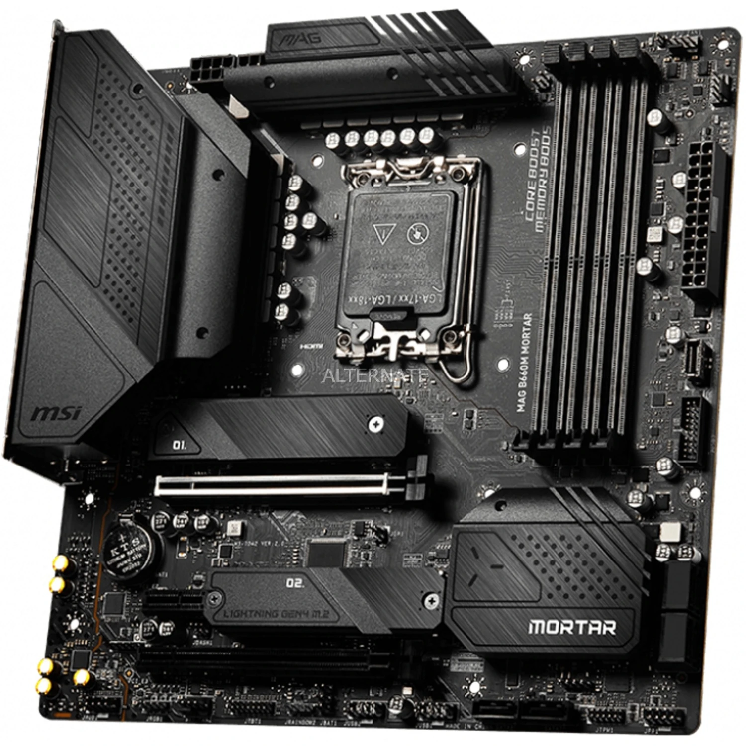 Das MSI MAG B660M MORTAR DDR4 Mainboard basiert auf dem Intel®-B660-Chipsatz und unterstützt Intel®-Prozessoren für den Sockel 1700 der 12ten Generation. Es verfügt über vier DDR4-DIMM-Slots im Dual-Channel-Betrieb für bis zu 128 GB Arbeitsspeicher. Zur weiteren Ausstattung des MSI MAG B660M MORTAR DDR4 gehören ein PCIe-4.0-x16-Slot, ein PCIe-3.0-x16-Slot und ein PCIe-3.0-x1-Slot. Außerdem verfügt das MSI MAG B660M MORTAR DDR4 über 8-Kanal-Sound, eine 2,5 Gigabit-LAN-Schnittstelle, vier SATA3-Anschlüsse, zwei M.2-Anschlüsse und eine Reihe an USB Schnittstellen.