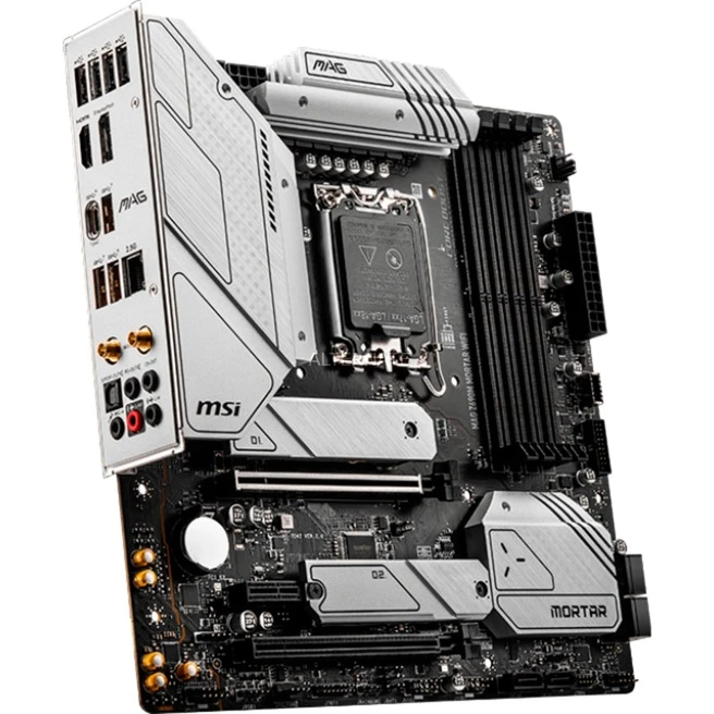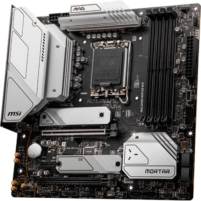 Das MSI MAG Z690M MORTAR WIFI Mainboard basiert auf dem Intel®-Z690-Chipsatz und unterstützt Intel®-Prozessoren für den Sockel 1700 der 12ten Generation. Es verfügt über vier DDR5-DIMM-Slots im Dual-Channel-Betrieb für bis zu 128 GB Arbeitsspeicher. Zur weiteren Ausstattung des MSI MAG Z690M MORTAR WIFI gehören ein PCIe-4.0-x16-Slot, ein PCIe-3.0-x16-Slot und ein PCIe-3.0-x1-Slot. Außerdem verfügt das MSI MAG Z690M MORTAR WIFI über 8-Kanal-Sound, eine 2,5 Gigabit-LAN-Schnittstelle, sechs SATA3-Anschlüsse, drei M.2-Anschlüsse, WiFi 6E, Bluetooth 5.2 und eine Reihe an USB Schnittstellen.
