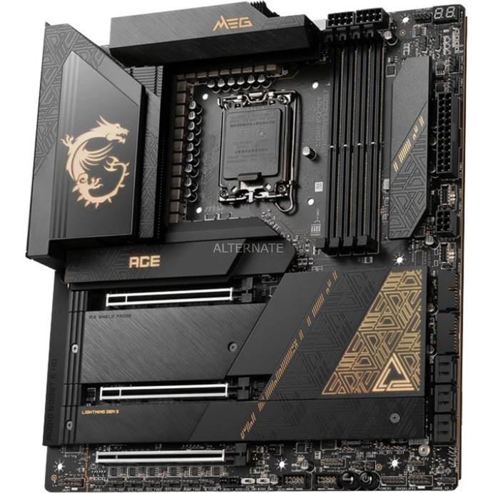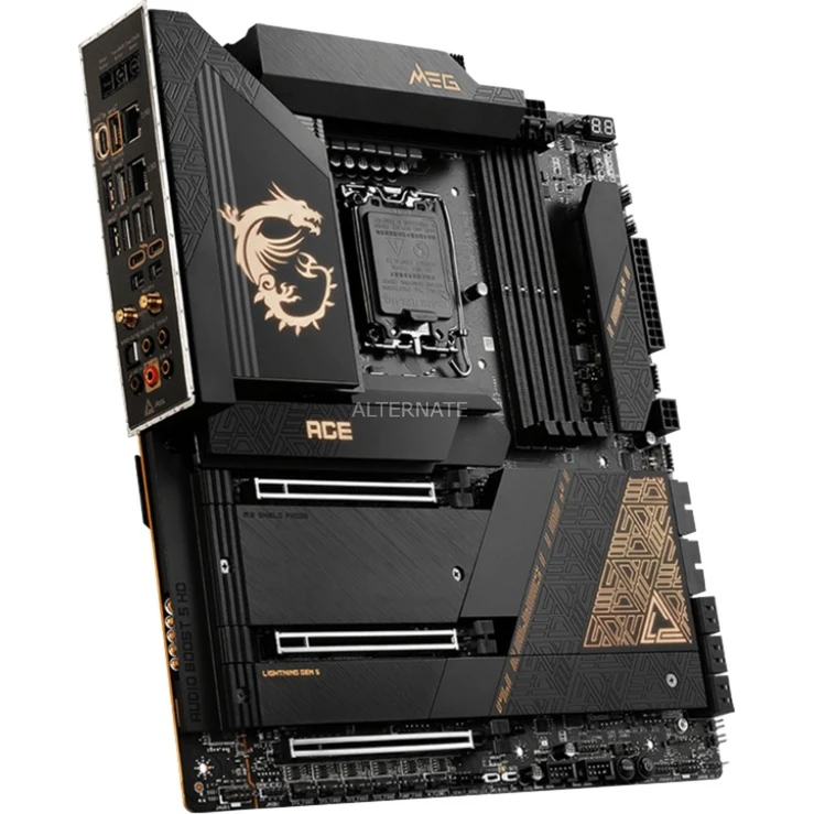 Das MSI MEG Z790 ACE Mainboard basiert auf dem Intel®-Z790-Chipsatz und unterstützt Intel®-Prozessoren für den Sockel 1700 der 13ten und 12ten Generation. Es verfügt über vier DDR5-DIMM-Slots im Dual-Channel-Betrieb für bis zu 128 GB Arbeitsspeicher. Zur weiteren Ausstattung des MSI MEG Z790 ACE gehören zwei PCIe-5.0-x16-Slots und ein PCIe-4.0-x16-Slot. Außerdem verfügt das MSI MEG Z790 ACE über 8-Kanal-Sound, eine zwei 2,5 Gigabit-LAN-Schnittstellen, sechs SATA3-Anschlüsse, Thunderbolt 4 Typ-C Ports, fünf M.2-Anschlüsse, WiFi 6E, Bluetooth 5.3 und eine Reihe an USB Schnittstellen.