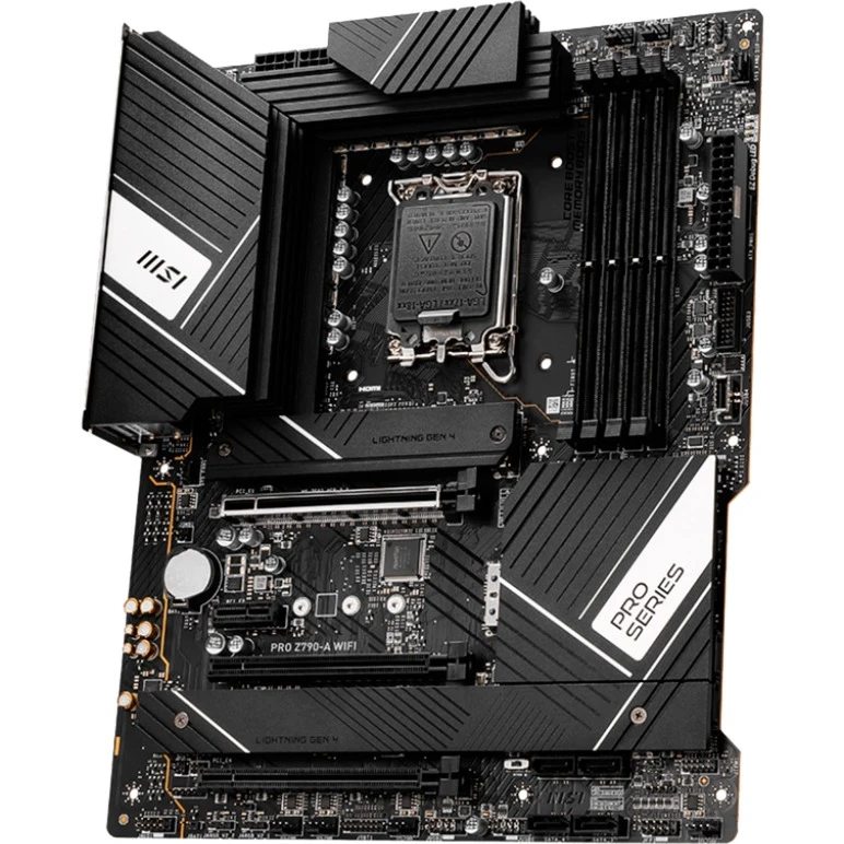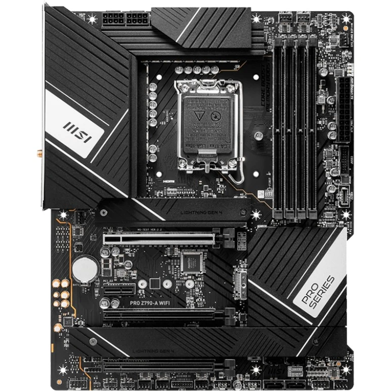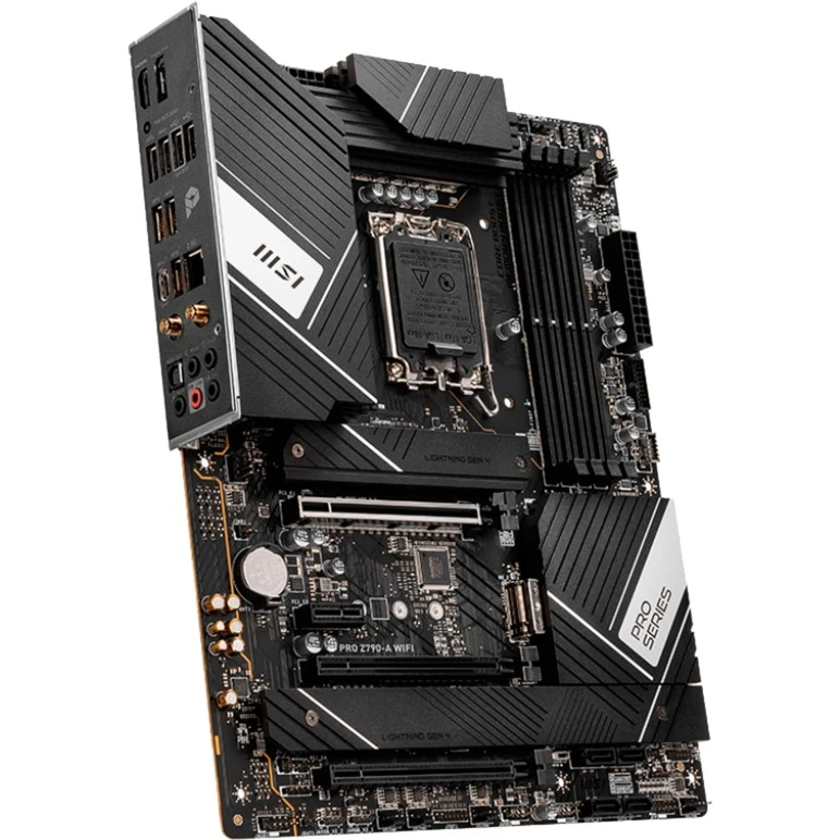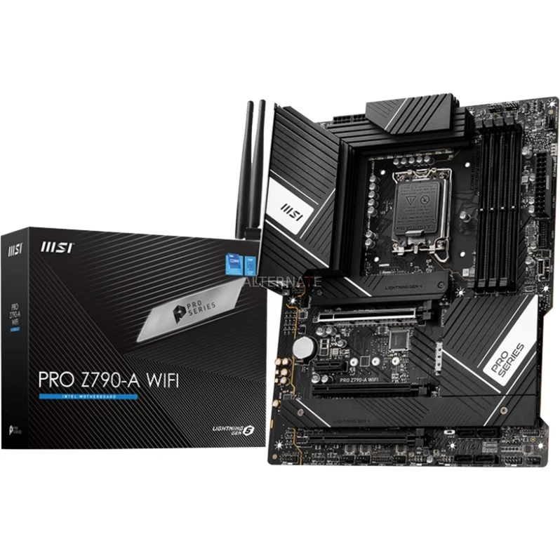 Das MSI PRO Z790-A WIFI Mainboard basiert auf dem Intel®-Z790-Chipsatz und unterstützt Intel®-Prozessoren für den Sockel 1700 der 13ten und 12ten Generation. Es verfügt über vier DDR5-DIMM-Slots im Dual-Channel-Betrieb für bis zu 128 GB Arbeitsspeicher. Zur weiteren Ausstattung des MSI PRO Z790-A WIFI gehören ein PCIe-5.0-x16-Slot, ein PCIe-4.0-x16-Slot, ein PCIe-3.0-x16-Slot und ein PCIe-3.0-x1-Slot. Außerdem verfügt das MSI PRO Z790-A WIFI über 8-Kanal-Sound, eine 2,5 Gigabit-LAN-Schnittstelle, sechs SATA3-Anschlüsse, vier M.2-Anschlüsse, WiFi 6E, Bluetooth 5.2 und eine Reihe an USB Schnittstellen.
