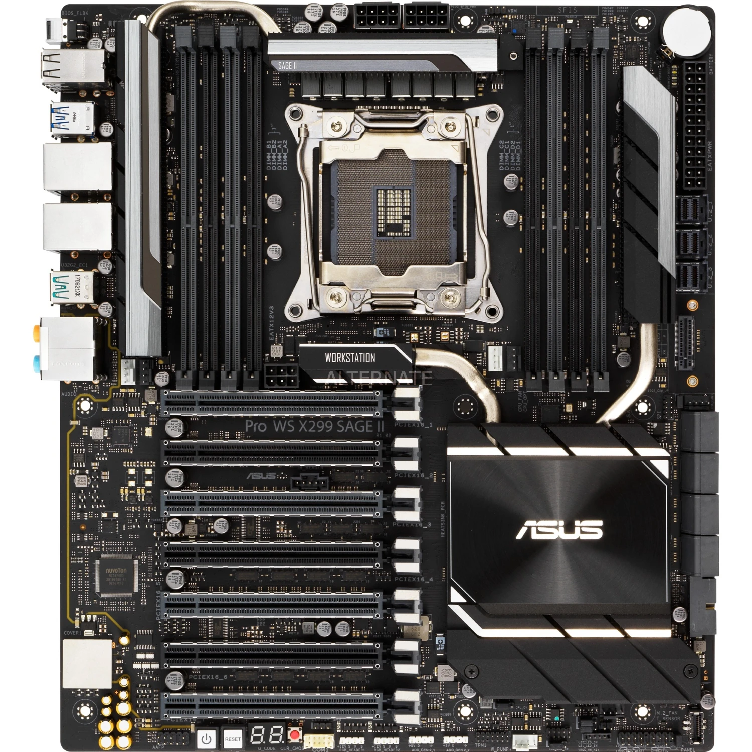 Das ASUS Pro WS X299 SAGE II basiert auf dem Intel®-X299-Chipsatz und unterstützt Intel®-Prozessoren für den Sockel 2066. Der Arbeitsspeicher des Pro WS X299 SAGE II lässt sich über acht Speicherbänke auf bis zu 256 GB DDR4 aufrüsten und unterstützt dabei Quad-Channel. Zur weiteren Ausstattung gehören sieben PCIe-3.0-x16-Slots. Außerdem verfügt das Pro WS X299 SAGE II über zwei 2.5 Gigabit-LAN-Ports, acht SATA3-Anschlüsse, zwei M.2-Anschlüsse, drei U.2-Anschlüssen und eine Reihe an USB Schnittstellen.
