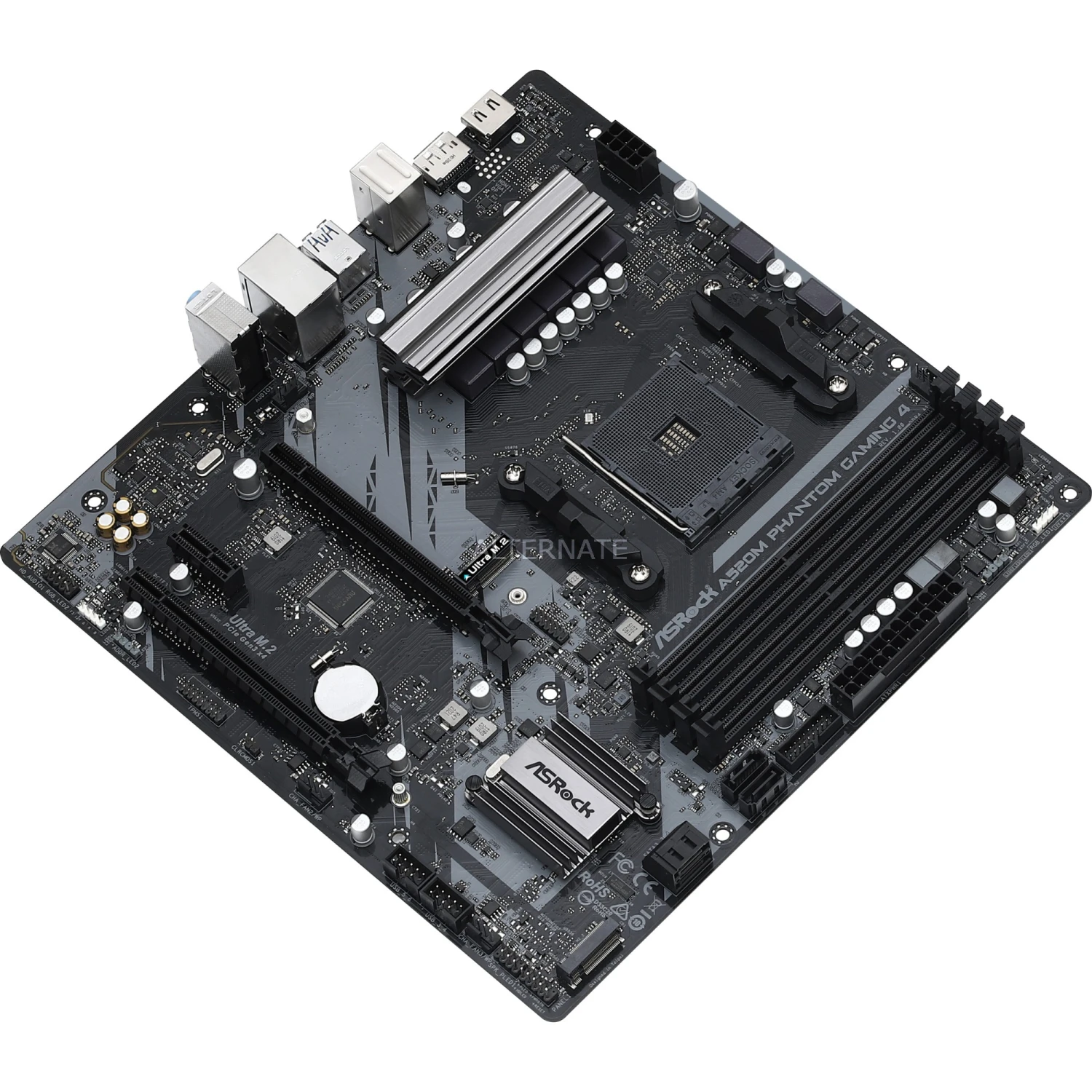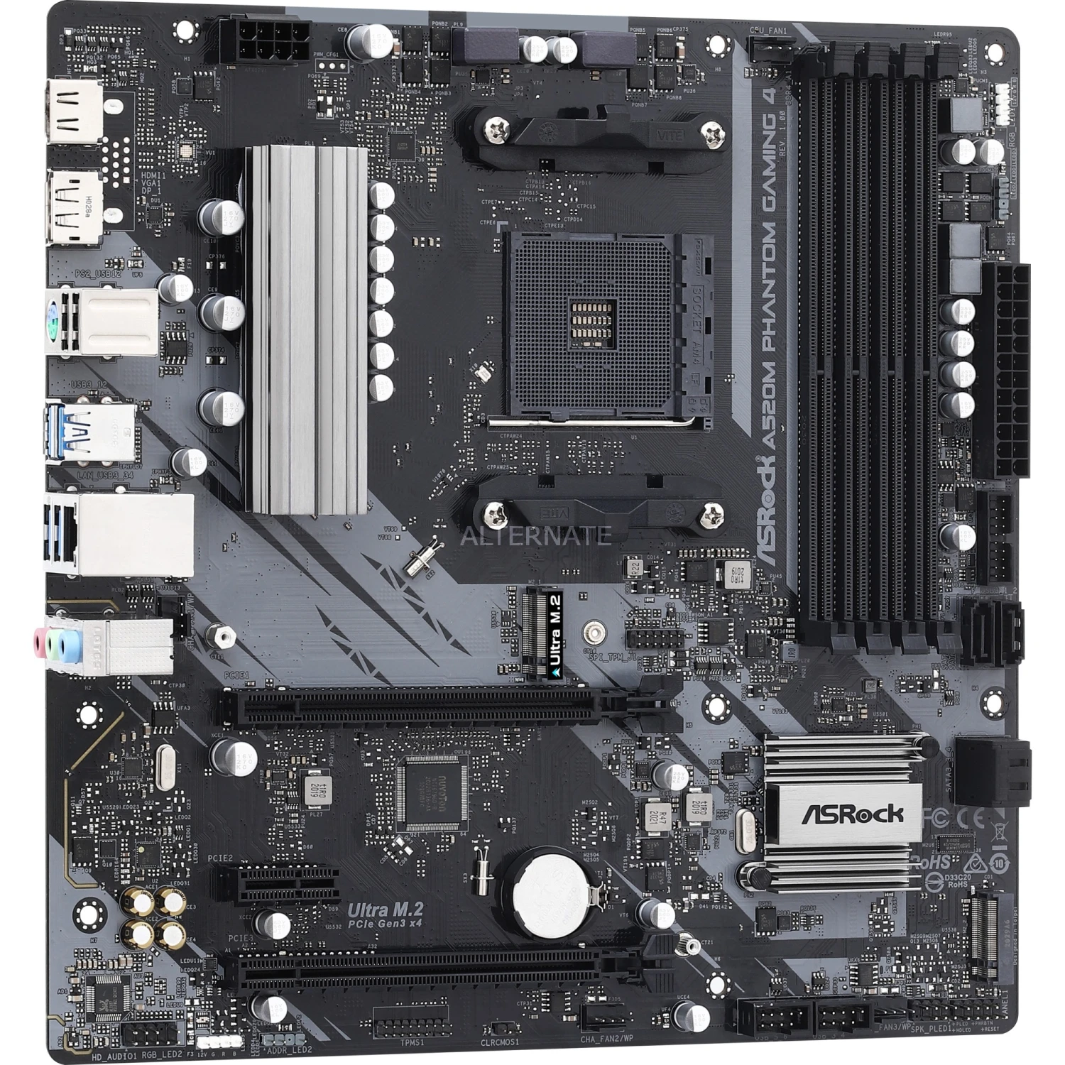 Das ASRock A520M PHANTOM GAMING 4 basiert auf dem AMD-A520-Chipsatz und unterstützt AMD-Prozessoren für den Sockel AM4. Es verfügt über vier DDR4-Slots für bis zu 128 GB Arbeitsspeicher. Zur weiteren Ausstattung des ASRock A520M PHANTOM GAMING 4 gehören zwei PCIe-3.0-x16-Slots und ein PCIe-3.0-x1-Slot. Außerdem verfügt das ASRock A520M PHANTOM GAMING 4 über 8-Kanal-Sound, eine Gigabit-LAN-Schnittstelle, vier SATA3-Anschlüsse, zwei M.2-Anschlüsse und eine Reihe an USB Schnittstellen.