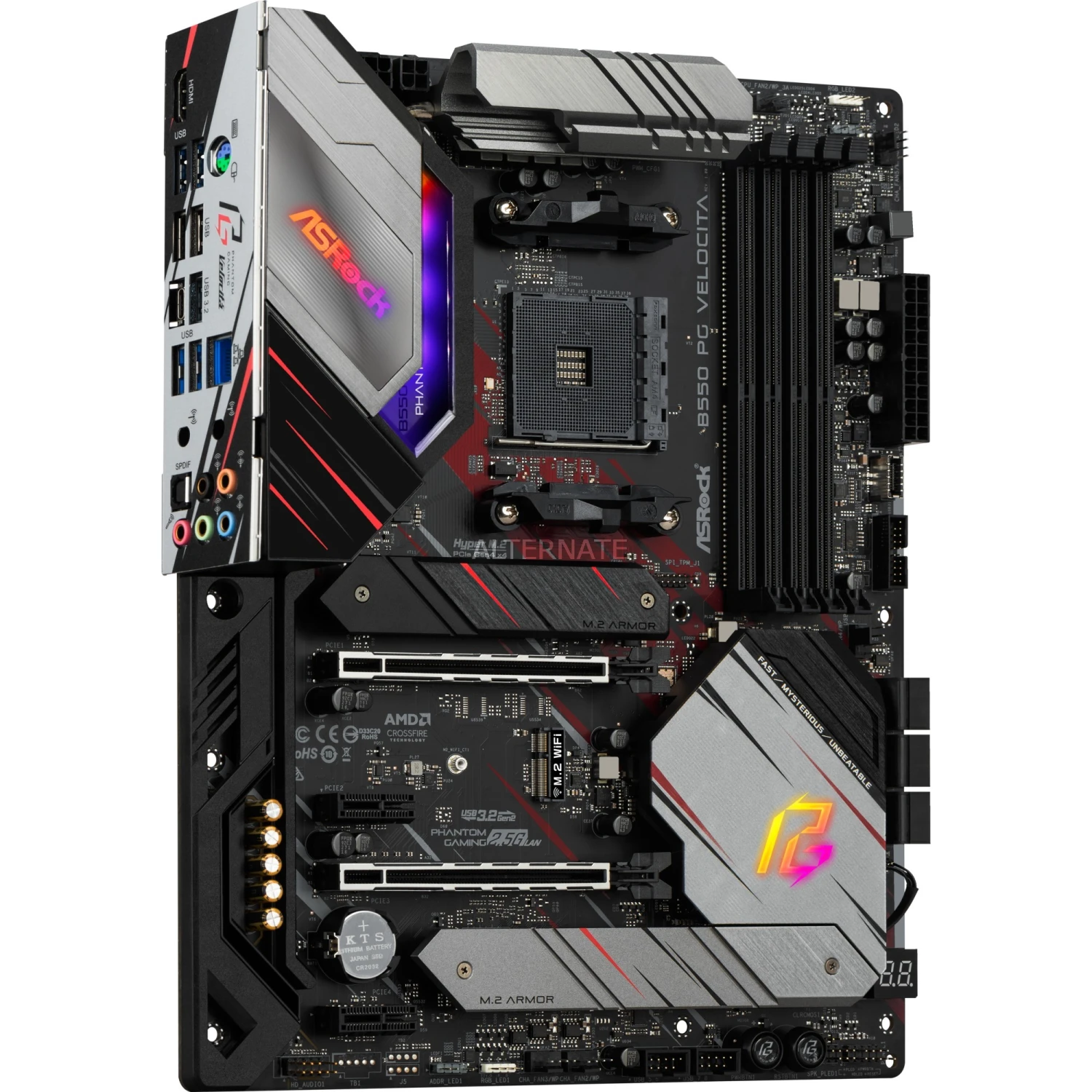 Das ASRock B550 PG Velocita basiert auf dem AMD-B550-Chipsatz und unterstützt AMD-Prozessoren für den Sockel AM4. Es verfügt über vier DDR4-Slots für bis zu 128 GB Arbeitsspeicher. Zur weiteren Ausstattung des ASRock B550 PG Velocita gehören ein PCIe-4.0-x16-Slot, ein PCIe-3.0-x16-Slot und zwei PCIe-3.0-x1-Slots. Außerdem verfügt das ASRock B550 PG Velocita über 8-Kanal-Sound, eine 2.5 Gigabit-LAN-Schnittstelle, sechs SATA3-Anschlüsse, zwei M.2-Anschlüsse und eine Reihe an USB Schnittstellen.