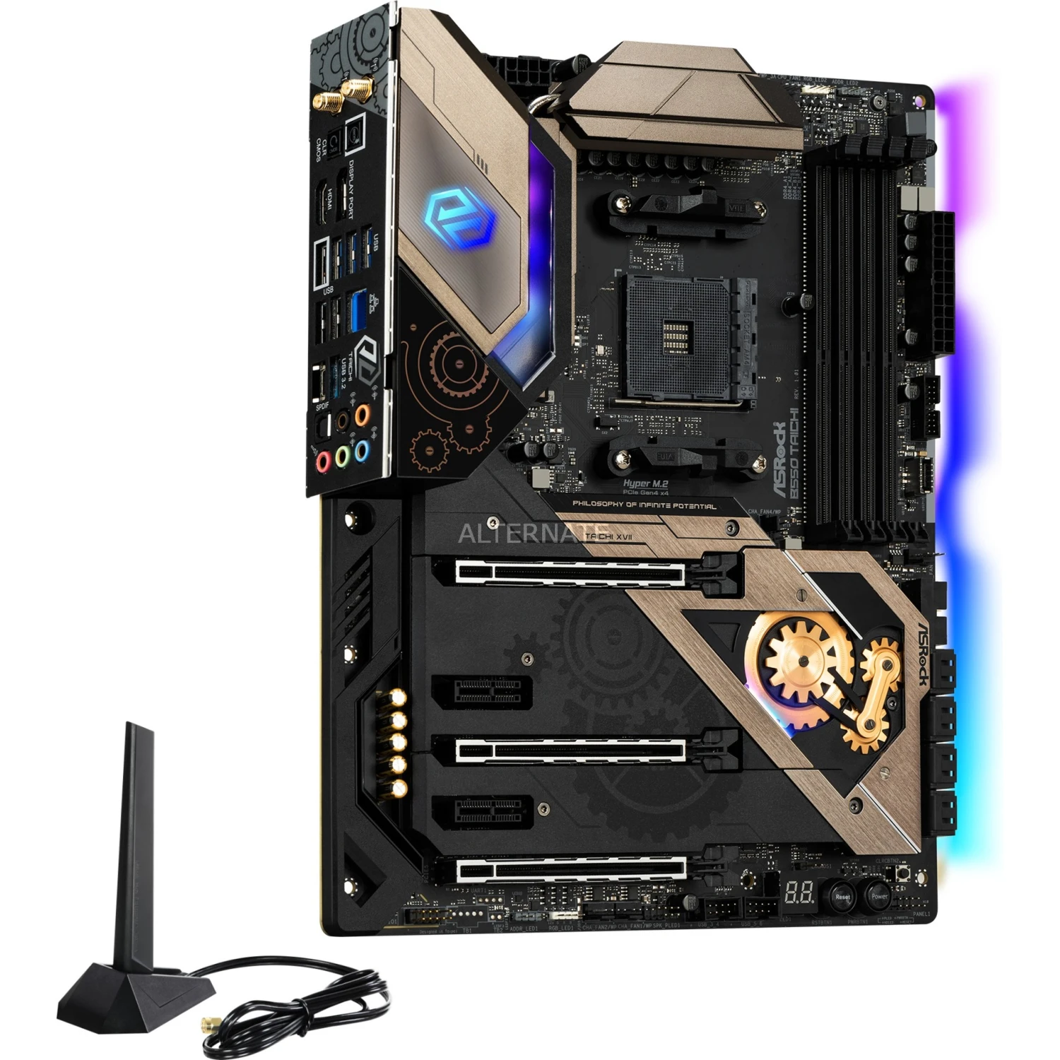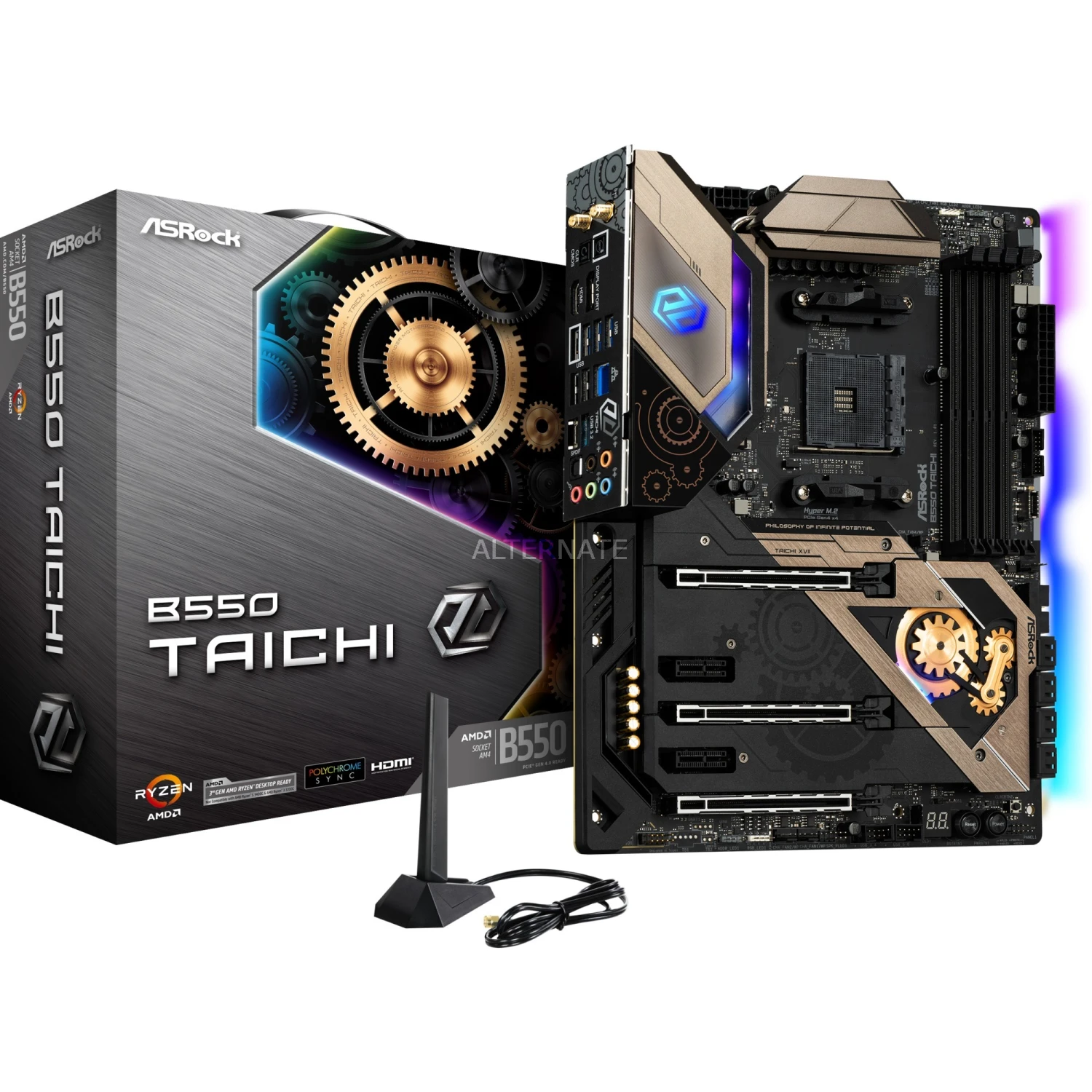 Das ASRock B550 Taichi basiert auf dem AMD-B550-Chipsatz und unterstützt AMD-Prozessoren für den Sockel AM4. Es verfügt über vier DDR4-Slots für bis zu 128 GB Arbeitsspeicher. Zur weiteren Ausstattung des ASRock B550 Taichi gehören ein PCIe-4.0-x16-Slot, zwei PCIe-3.0-x16-Slots und zwei PCIe-3.0-x1-Slots. Außerdem verfügt das ASRock B550 Taichi über 8-Kanal-Sound, eine 2.5 Gigabit-LAN-Schnittstelle, acht SATA3-Anschlüsse, zwei M.2-Anschlüsse, WiFi 6, Bluetooth 5.1 und eine Reihe an USB Schnittstellen.