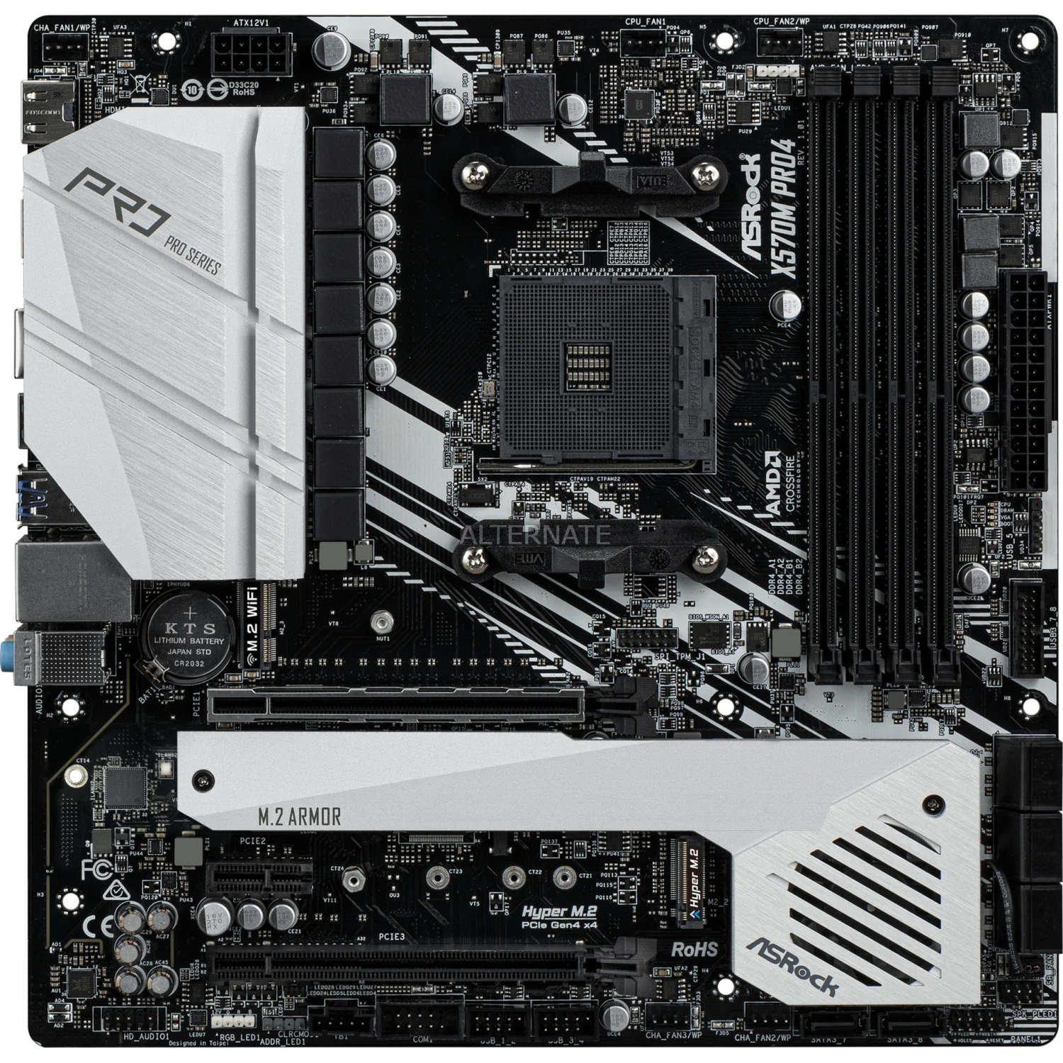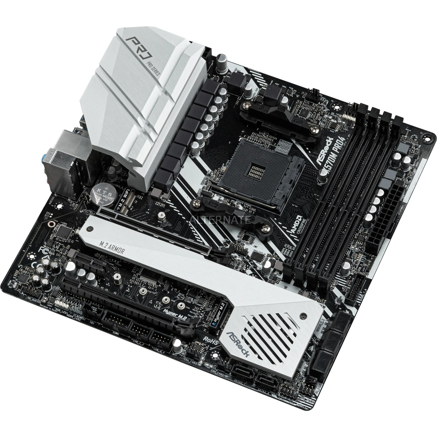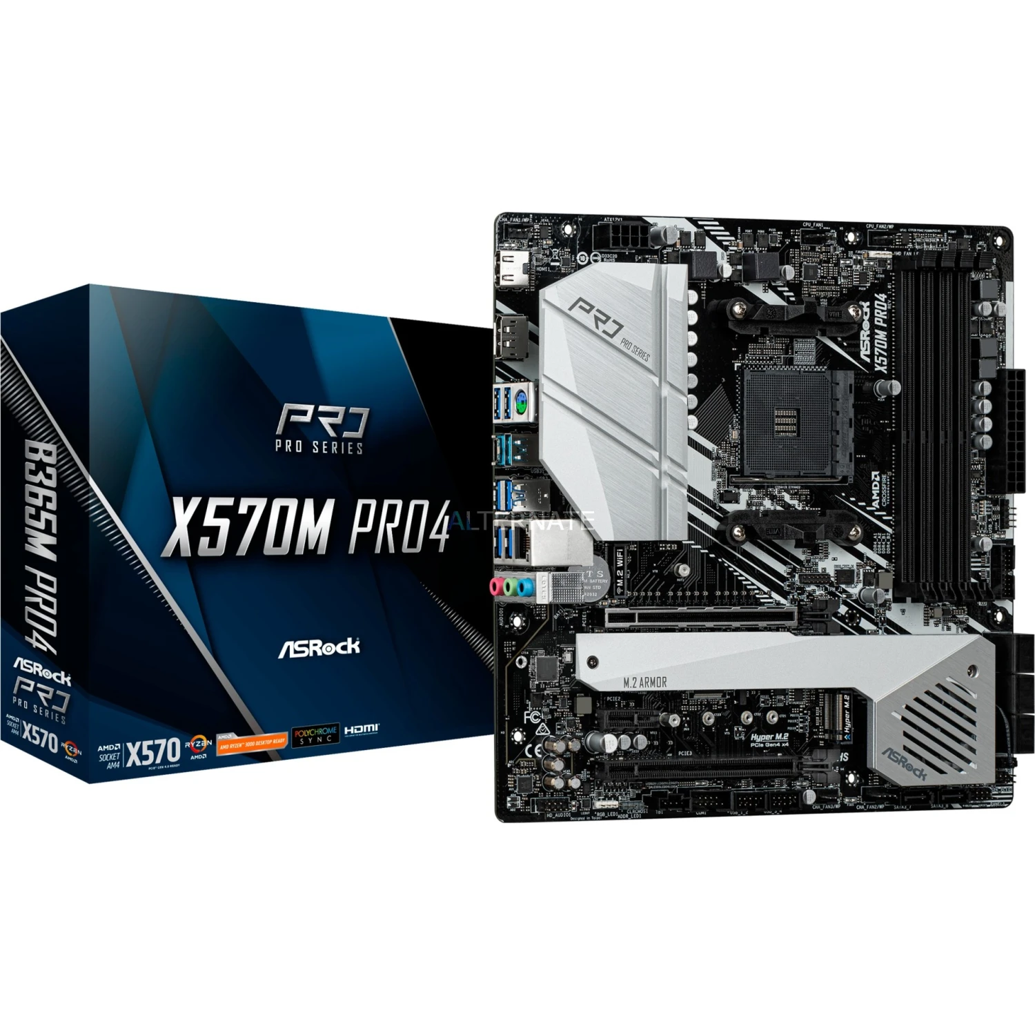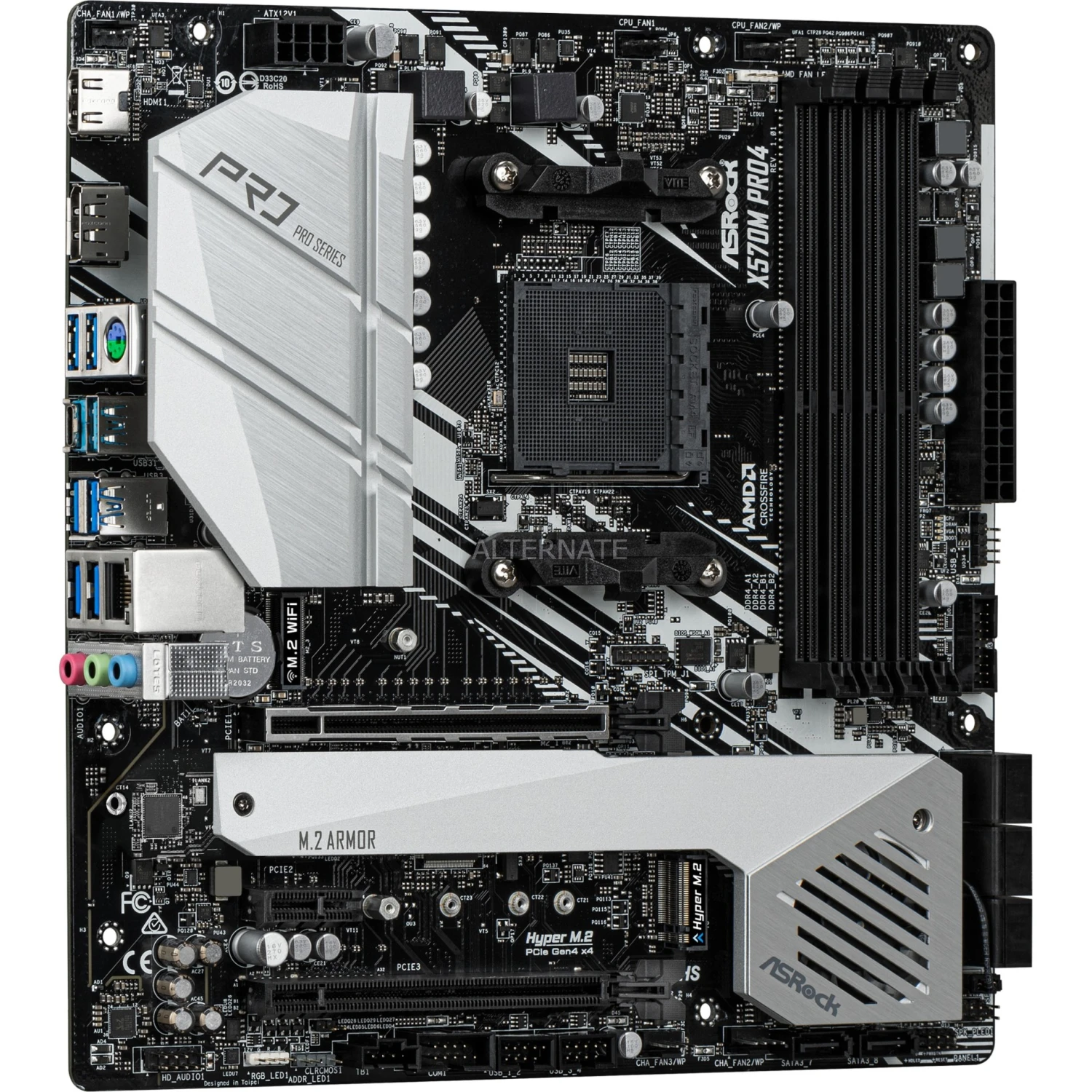 Das ASRock X570M PRO4 basiert auf dem AMD-X570-Chipsatz und unterstützt AMD-Prozessoren für den Sockel AM4. Es verfügt über vier DDR4-Slots für bis zu 128 GB Arbeitsspeicher. Zur weiteren Ausstattung des ASRock X570M PRO4 gehören zwei PCIe-4.0-x16-Slots und ein PCIe 3.0 x1 Slot. Außerdem verfügt das ASRock X570M PRO4 über 8-Kanal-Sound, eine Gigabit-LAN-Schnittstelle, acht SATA3-Anschlüsse, zwei M.2-Anschlüsse und eine Reihe an USB Schnittstellen.