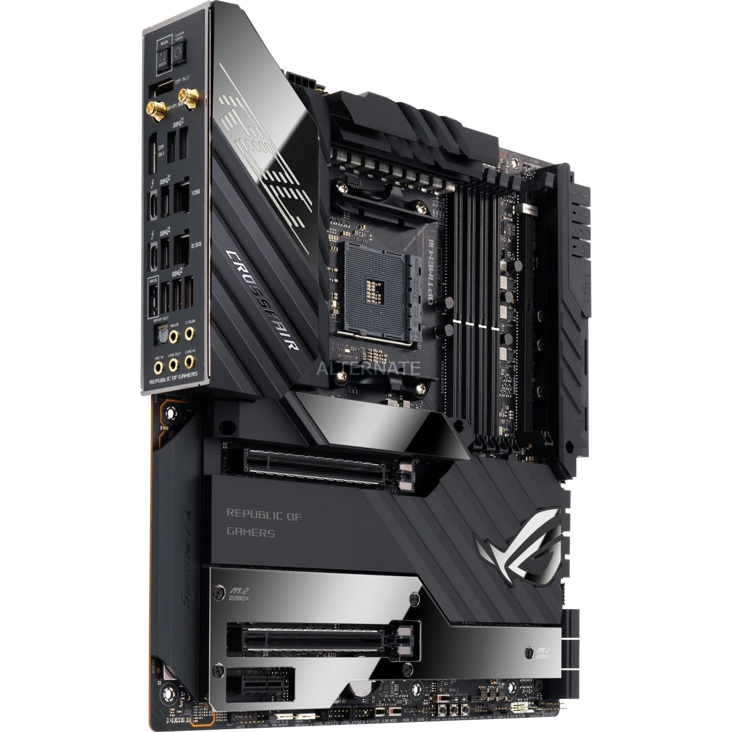 Das ASUS ROG CROSSHAIR VIII EXTREME basiert auf dem AMD-X570-Chipsatz und unterstützt AMD-Prozessoren für den Sockel AM4. Es verfügt über vier DDR4-Slots für bis zu 128 GB Arbeitsspeicher. Zur weiteren Ausstattung des ASUS ROG CROSSHAIR VIII EXTREME gehören drei PCIe-4.0-x16-Slots und einen PCIe 4.0 x1 Slot. Außerdem verfügt das ASUS ROG CROSSHAIR VIII EXTREME über 8-Kanal-Sound, eine 10 Gigabit-LAN-Schnittstelle, eine 2.5 Gigabit-LAN-Schnittstelle, sechs SATA3-Anschlüsse, drei M.2-Anschlüsse, WiFi 6E, Bluetooth 5.2 und eine Reihe an USB Schnittstellen.