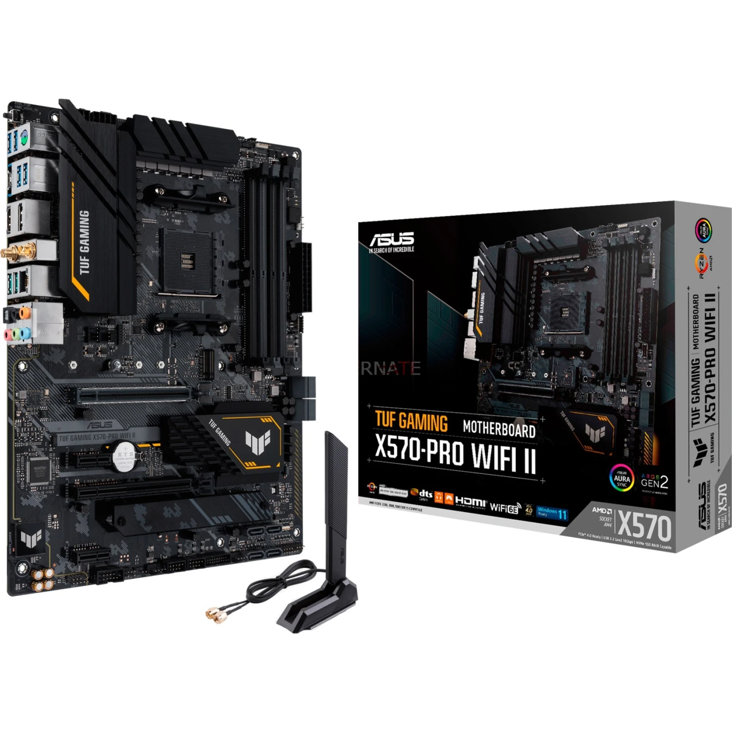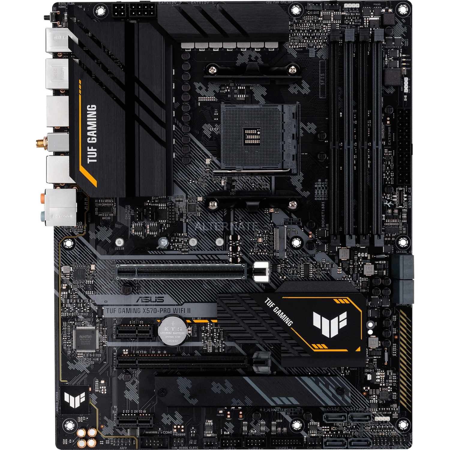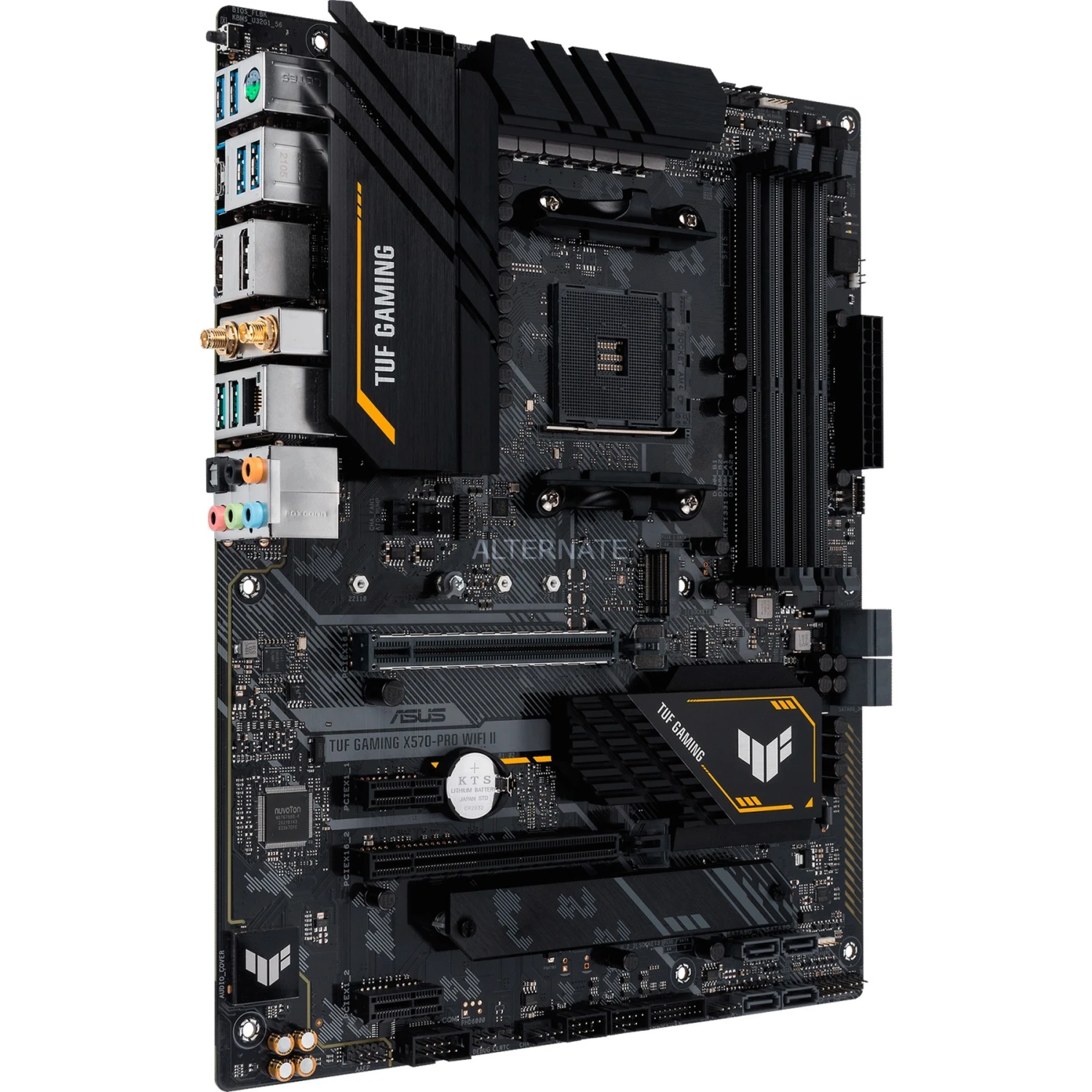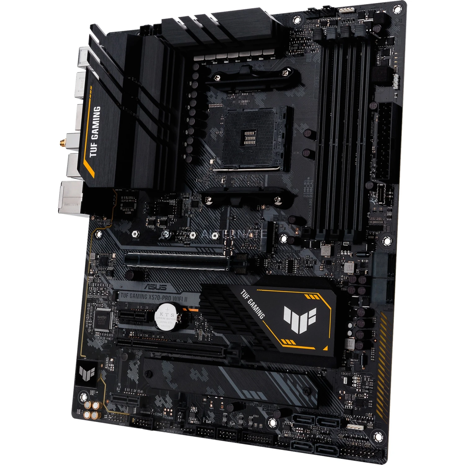 Das ASUS TUF X570-PRO WI-FI II basiert auf dem AMD-X570-Chipsatz und unterstützt AMD-Prozessoren für den Sockel AM4. Es verfügt über vier DDR4-Slots für bis zu 128 GB Arbeitsspeicher. Zur weiteren Ausstattung des ASUS TUF X570-PRO WI-FI II gehören zwei PCIe-4.0-x16-Slots und zwei PCIe-4.0-x1-Slots. Außerdem verfügt das ASUS TUF X570-PRO WI-FI II über 8-Kanal-Sound, eine 2.5 Gigabit-LAN-Schnittstelle, acht SATA3-Anschlüsse, zwei M.2-Anschlüsse, WiFi 6, Bluetooth 5.1 und eine Reihe an USB Schnittstellen.