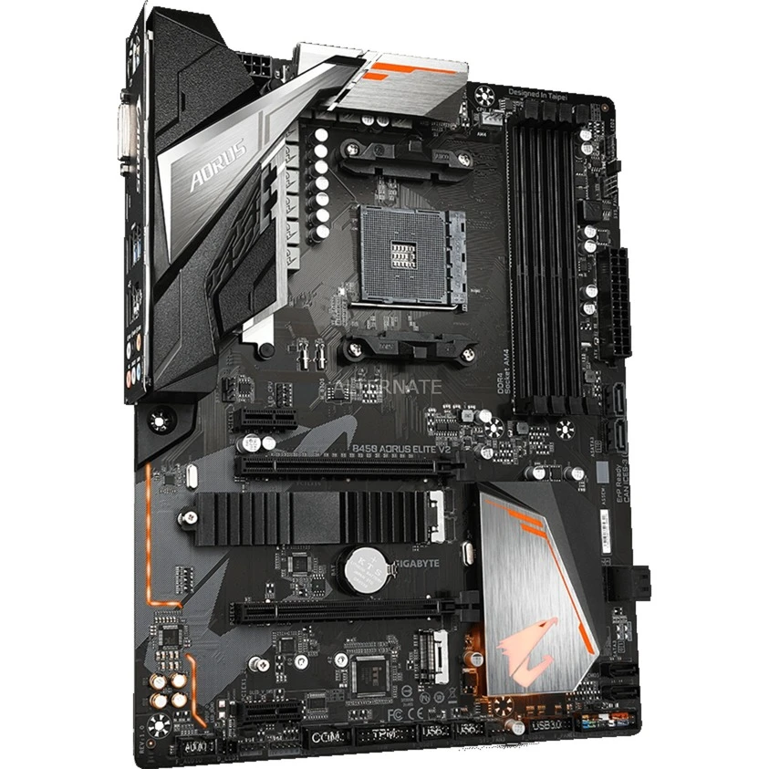 Das GIGABYTE B450 AORUS ELITE V2 basiert auf dem AMD-B450-Chipsatz und unterstützt AMD-Prozessoren für den Sockel AM4. Es verfügt über vier DDR4-Slots für bis zu 64 GB Arbeitsspeicher. Zur weiteren Ausstattung des GIGABYTE B450 AORUS ELITE V2 gehört eine CPU-abhängige Grafiklösung, ein PCIe-3.0-x16-Slot, ein PCIe-3.0-x4-Slot und zwei PCIe-3.0-x1-Slots. Außerdem verfügt das GIGABYTE B450 AORUS ELITE V2 über 8-Kanal-Sound, eine Gigabit-LAN-Schnittstelle sowie sechs SATA3-, zwei M.2-Anschlüsse und eine Reihe an USB Schnittstellen.