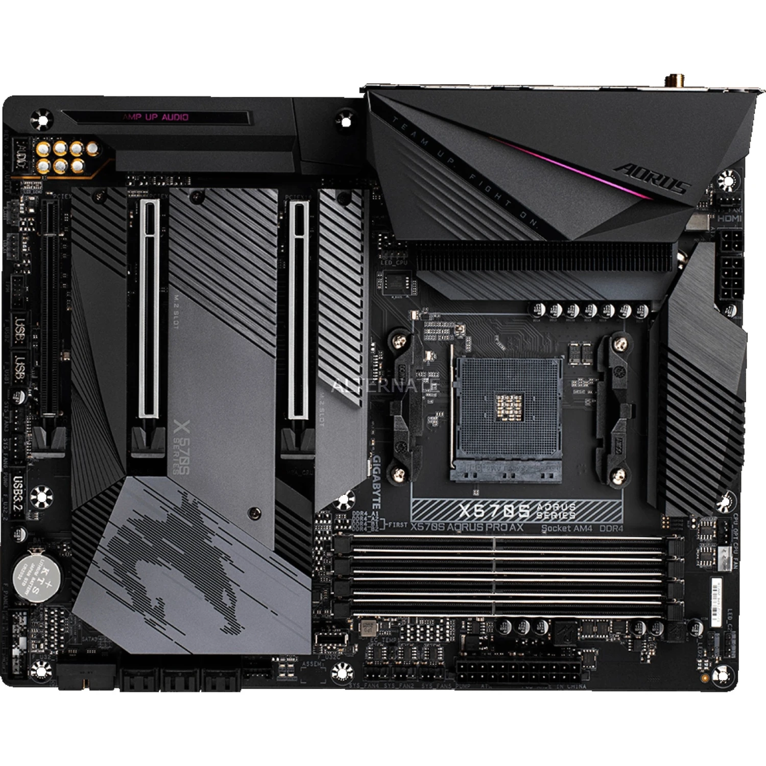 Das GIGABYTE X570S AORUS PRO AX basiert auf dem AMD-X570-Chipsatz und unterstützt AMD-Prozessoren für den Sockel AM4. Es verfügt über vier DDR4-Slots für bis zu 128 GB Arbeitsspeicher. Zur weiteren Ausstattung des GIGABYTE X570S AORUS PRO AX gehören drei PCIe-x16-Slots. Außerdem verfügt das GIGABYTE X570S AORUS PRO AX über 8-Kanal-Sound, eine 2,5-Gigabit-LAN-Schnittstelle, Wi-Fi 6, Bluetooth 5.1, sechs SATA3-Anschlüsse, drei M.2-Anschlüsse und eine Reihe an USB Schnittstellen.