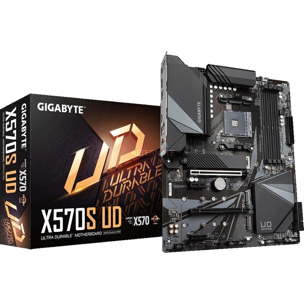 Das GIGABYTE X570S UD basiert auf dem AMD-X570-Chipsatz und unterstützt AMD-Prozessoren für den Sockel AM4. Es verfügt über vier DDR4-Slots für bis zu 128 GB Arbeitsspeicher. Zur weiteren Ausstattung des GIGABYTE X570S X570S UD gehören drei PCIe-x16-Slots. Außerdem verfügt das GIGABYTE X570S X570S UD über 8-Kanal-Sound, eine 2,5-Gigabit-LAN-Schnittstelle, sechs SATA3-Anschlüsse, vier M.2-Anschlüsse und eine Reihe an USB Schnittstellen.