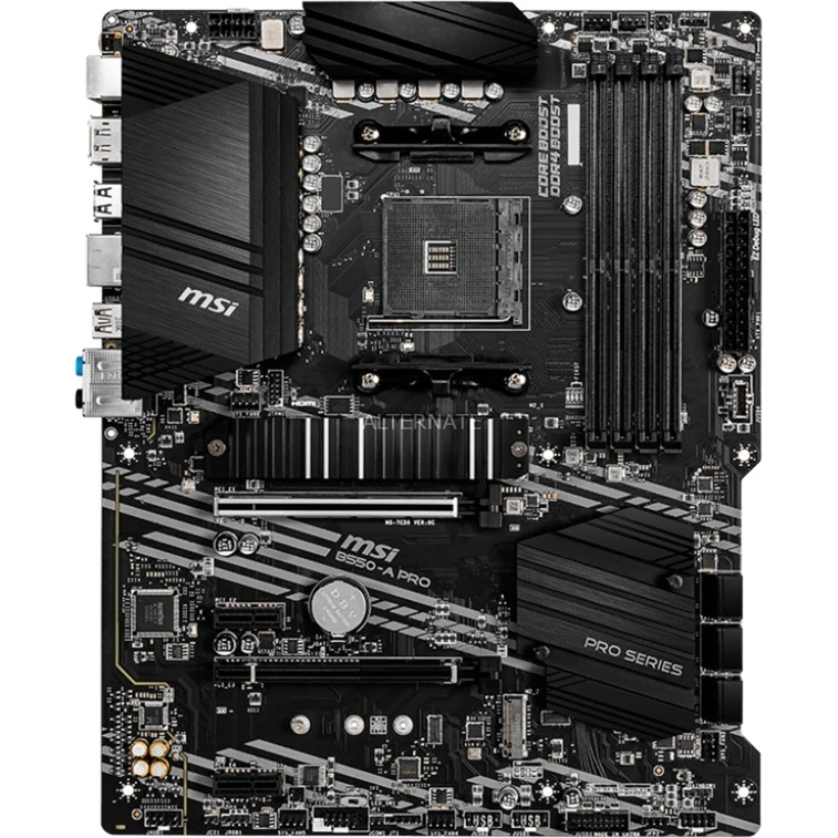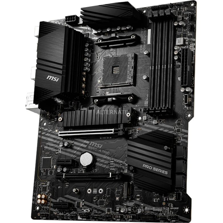 Das MSI B550-A PRO basiert auf dem AMD-B550-Chipsatz und unterstützt AMD-Prozessoren für den Sockel AM4. Es verfügt über vier DDR4-Slots für bis zu 128 GB Arbeitsspeicher. Zur weiteren Ausstattung des MSI B550-A PRO gehören ein PCIe-4.0-x16-Slot, ein PCIe-3.0-x16-Slot und zwei PCIe-3.0-x1-Slots. Außerdem verfügt das MSI B550-A PRO über 8-Kanal-Sound, eine Gigabit-LAN-Schnittstelle, sechs SATA3-Anschlüsse, zwei M.2-Anschlüsse und eine Reihe an USB Schnittstellen.