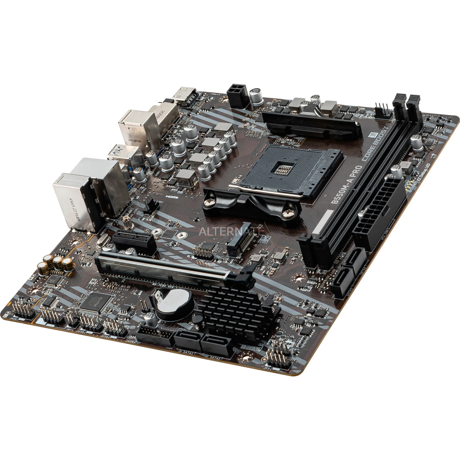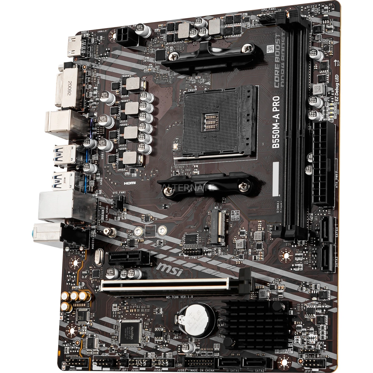 Das MSI B550M-A PRO basiert auf dem AMD-B550-Chipsatz und unterstützt AMD-Prozessoren für den Sockel AM4. Es verfügt über zwei DDR4-Slots für bis zu 64 GB Arbeitsspeicher. Zur weiteren Ausstattung des MSI B550M-A PRO gehören ein PCIe-4.0-x16-Slot und ein PCIe-3.0-x1-Slot. Außerdem verfügt das MSI B550M-A PRO über 8-Kanal-Sound, eine Gigabit-LAN-Schnittstelle, vier SATA3-Anschlüsse, einen M.2-Anschluss und eine Reihe an USB Schnittstellen.