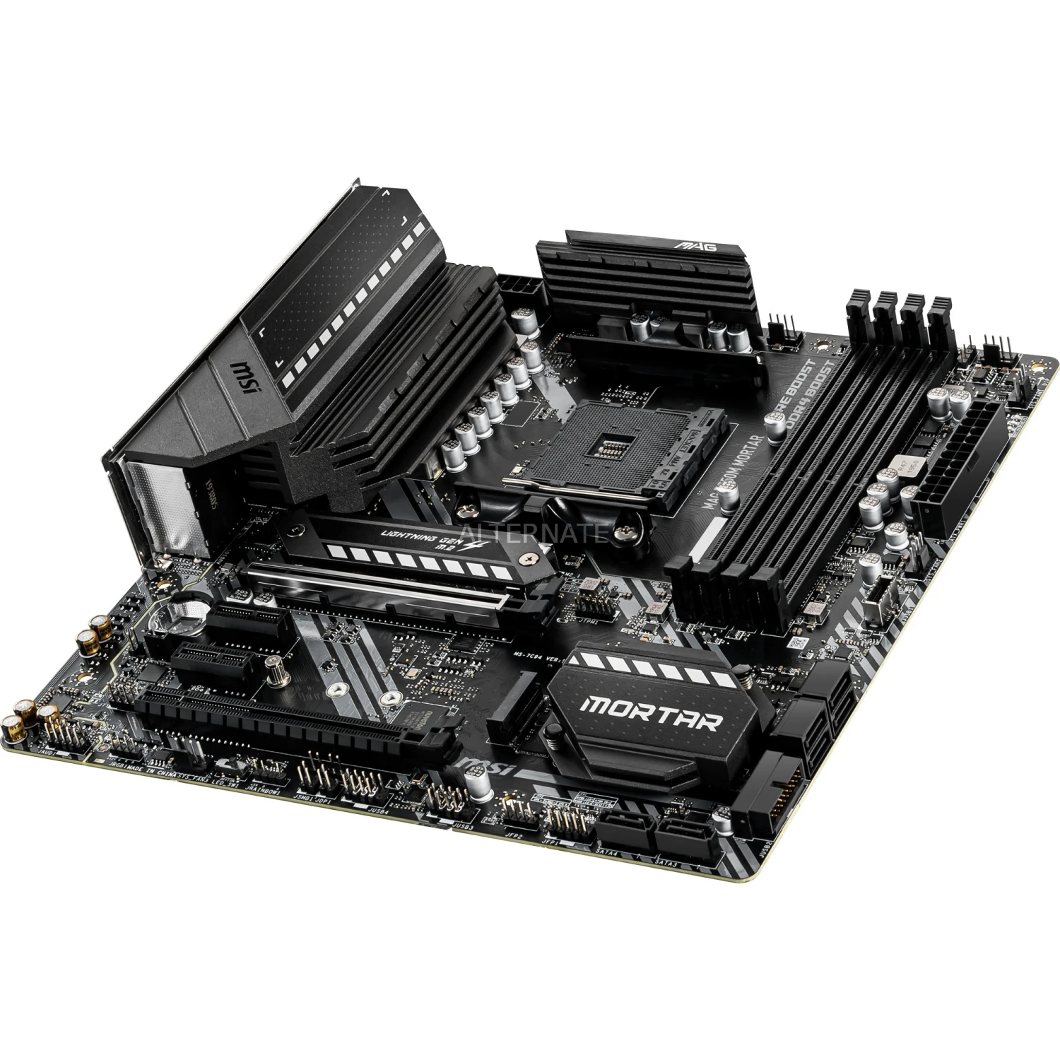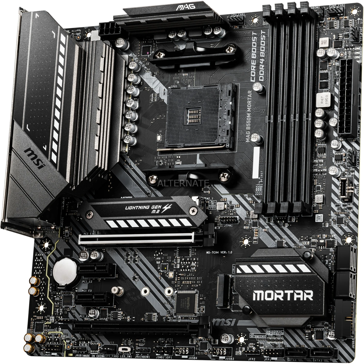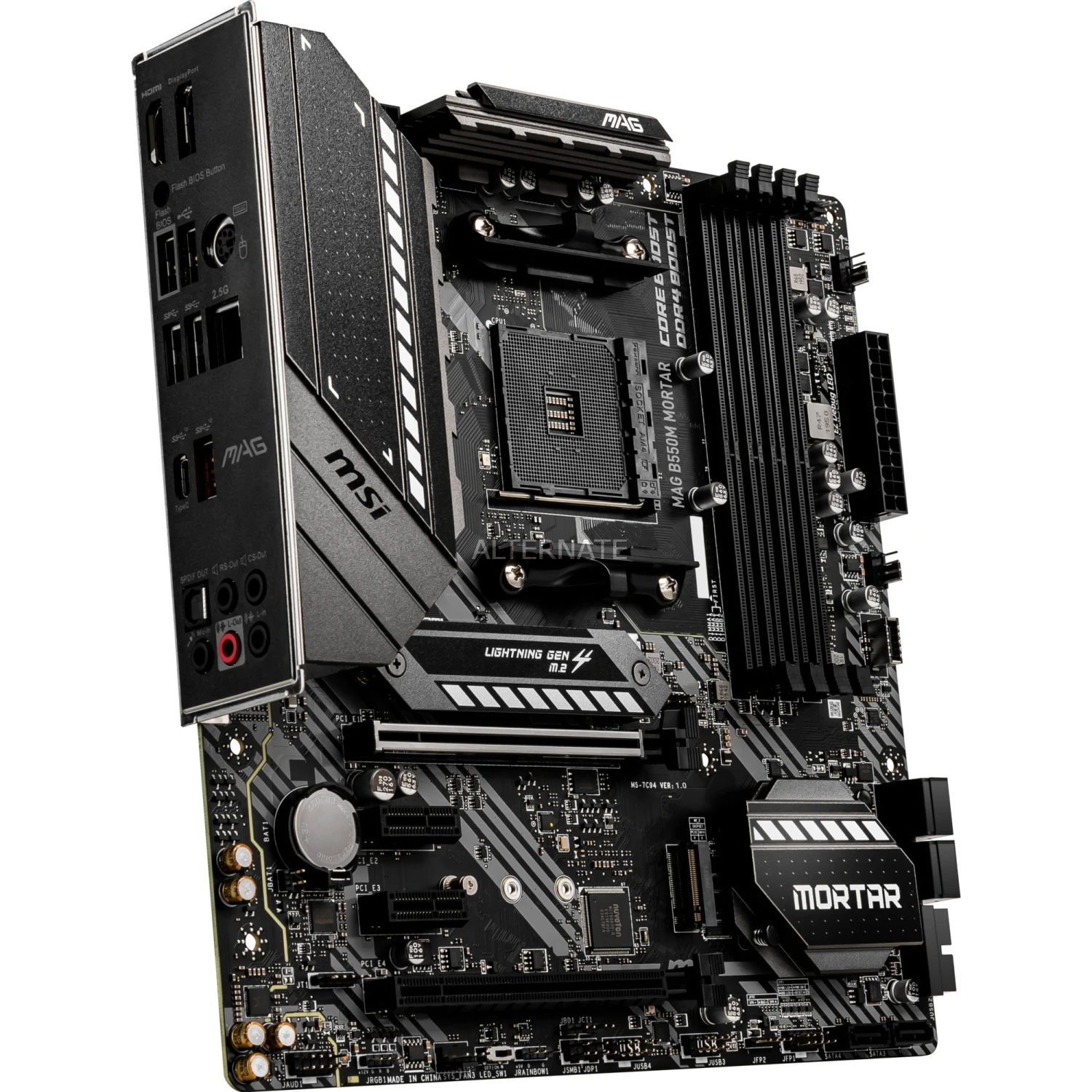 Das MSI MAG B550M MORTAR basiert auf dem AMD-B550-Chipsatz und unterstützt AMD-Prozessoren für den Sockel AM4. Es verfügt über vier DDR4-Slots für bis zu 128 GB Arbeitsspeicher. Zur weiteren Ausstattung des MSI MAG B550M MORTAR gehören ein PCIe-4.0-x16-Slot, ein PCIe-3.0-x16-Slot und zwei PCIe-3.0-x1-Slots. Außerdem verfügt das MSI MAG B550M MORTAR über 8-Kanal-Sound, eine 2.5 Gigabit-LAN-Schnittstelle, sechs SATA3-Anschlüsse, zwei M.2-Anschlüsse und eine Reihe an USB Schnittstellen.