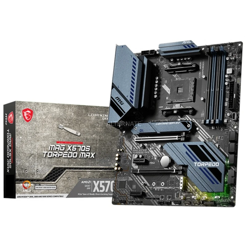 Das MSI MAG X570S TORPEDO MAX basiert auf dem AMD-X570-Chipsatz und unterstützt AMD-Prozessoren für den Sockel AM4. Es verfügt über vier DDR4-Slots für bis zu 128 GB Arbeitsspeicher. Zur weiteren Ausstattung des MSI MAG X570S TORPEDO MAX gehören ein PCIe-4.0-x16-Slot, ein PCIe-3.0-x16-Slot und zwei PCIe-3.0-x1-Slots. Außerdem verfügt das MSI MAG X570S TORPEDO MAX über 8-Kanal-Sound, eine 2.5 Gigabit-LAN-Schnittstelle, eine Gigabit-LAN-Schnittstelle, sechs SATA3-Anschlüsse, zwei M.2-Anschlüsse und eine Reihe an USB Schnittstellen.