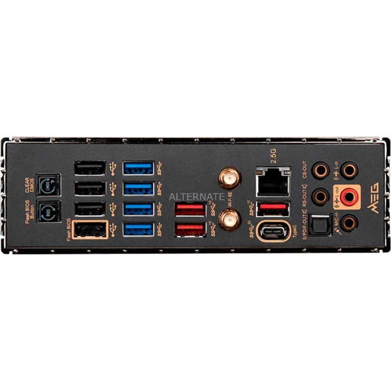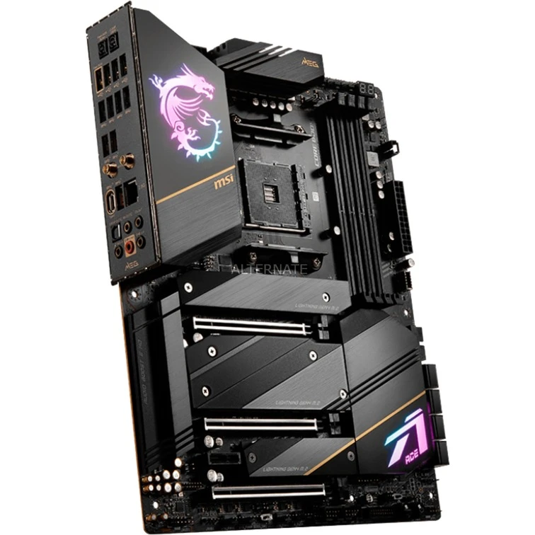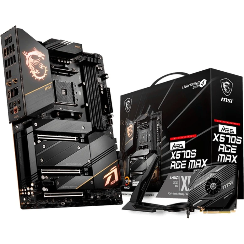 Das MSI MEG X570S ACE MAX basiert auf dem AMD-X570-Chipsatz und unterstützt AMD-Prozessoren für den Sockel AM4. Es verfügt über vier DDR4-Slots für bis zu 128 GB Arbeitsspeicher. Zur weiteren Ausstattung des MSI MEG X570S ACE MAX gehören ein PCIe-4.0-x16-Slot, zwei PCIe-3.0-x16-Slot und ein PCIe-3.0-x1-Slot. Außerdem verfügt das MSI MEG X570S ACE MAX über 8-Kanal-Sound, eine 2.5 Gigabit-LAN-Schnittstelle, WiFi 6E, Bluetooth 5.2, acht SATA3-Anschlüsse, vier M.2-Anschlüsse und eine Reihe an USB Schnittstellen.