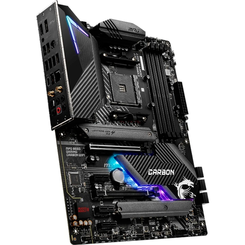 Das MSI MPG B550 GAMING CARBON WIFI basiert auf dem AMD-B550-Chipsatz und unterstützt AMD-Prozessoren für den Sockel AM4. Es verfügt über vier DDR4-Slots für bis zu 128 GB Arbeitsspeicher. Zur weiteren Ausstattung des MSI MPG B550 GAMING CARBON WIFI gehören ein PCIe-4.0-x16-Slot, ein PCIe-3.0-x16-Slot und drei PCIe-3.0-x1-Slots. Außerdem verfügt das MSI MPG B550 GAMING CARBON WIFI über 8-Kanal-Sound, eine 2.5 Gigabit-LAN-Schnittstelle, sechs SATA3-Anschlüsse, zwei M.2-Anschlüsse, WiFi 6, Bluetooth 5.1 und eine Reihe an USB Schnittstellen.