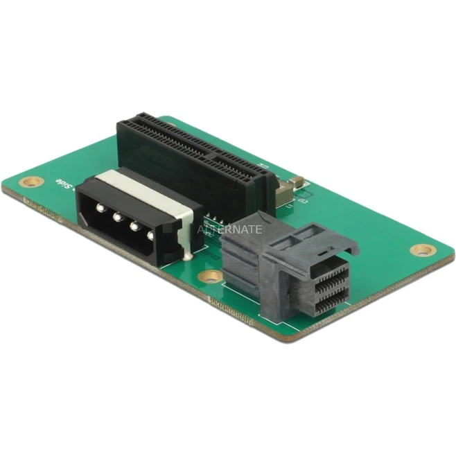 Dieser Delock Adapter kann über die SFF-8643 Schnittstelle in das System eingebunden werden und stellt dann einen PCI Express x4 NVMe Slot zur Verfügung. An diesen Slot können dann z. B. PCI Express Karten mit M.2 Slot für M.2 PCIe Module angeschlossen werden.